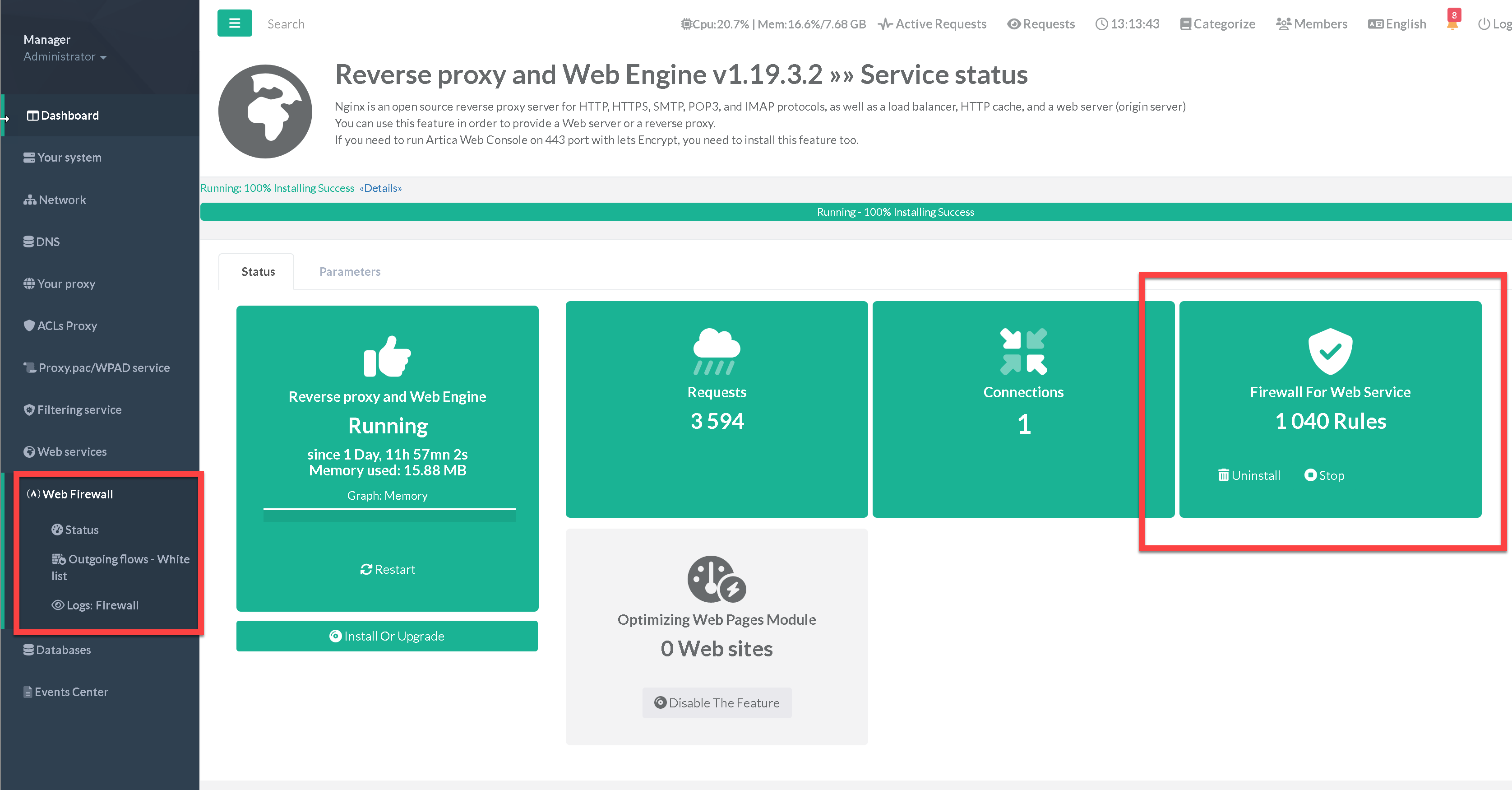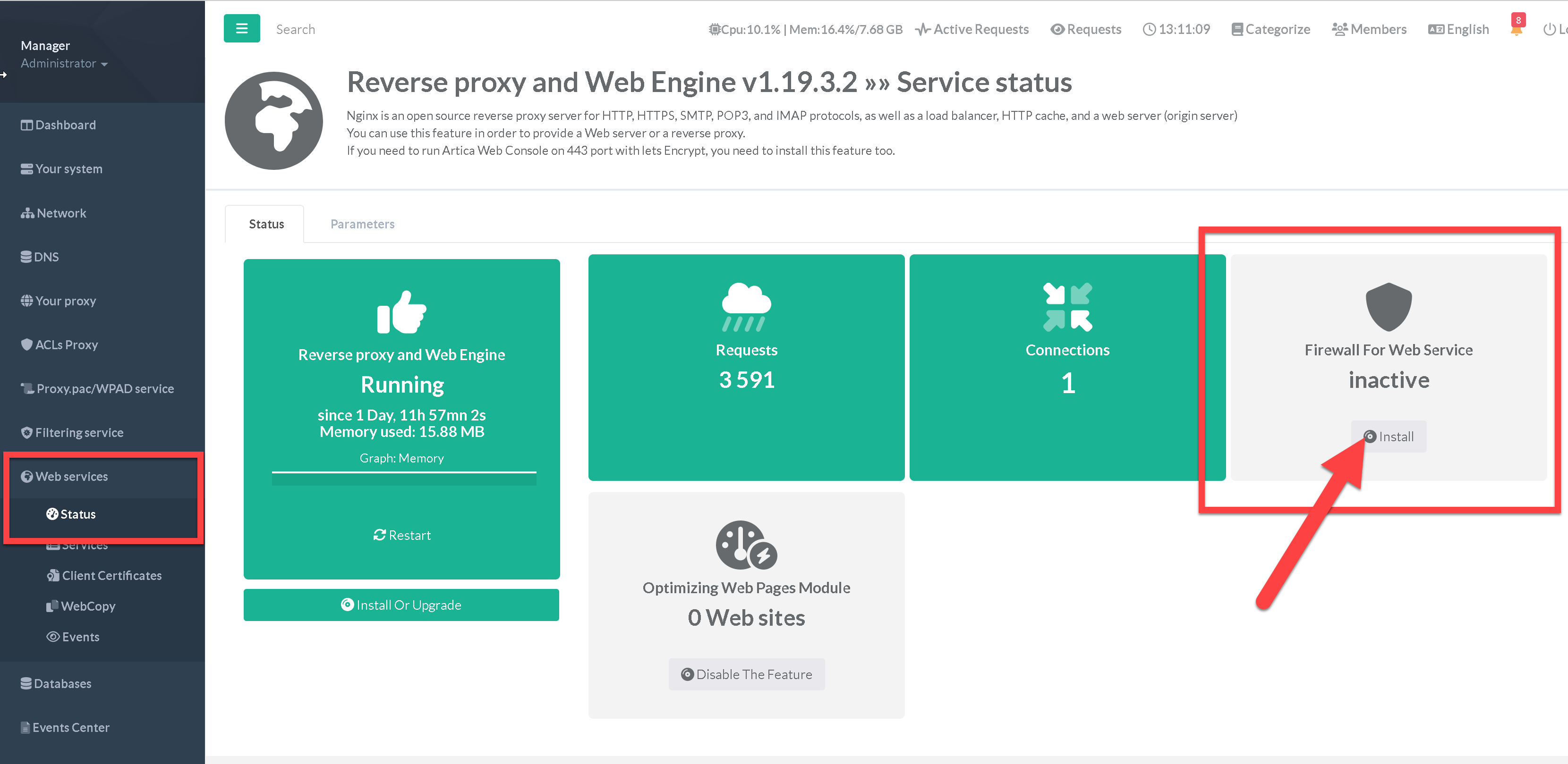Under the “Web services" / “Status” section, click on “Install” button under the “Firewall For Web Service” widget.