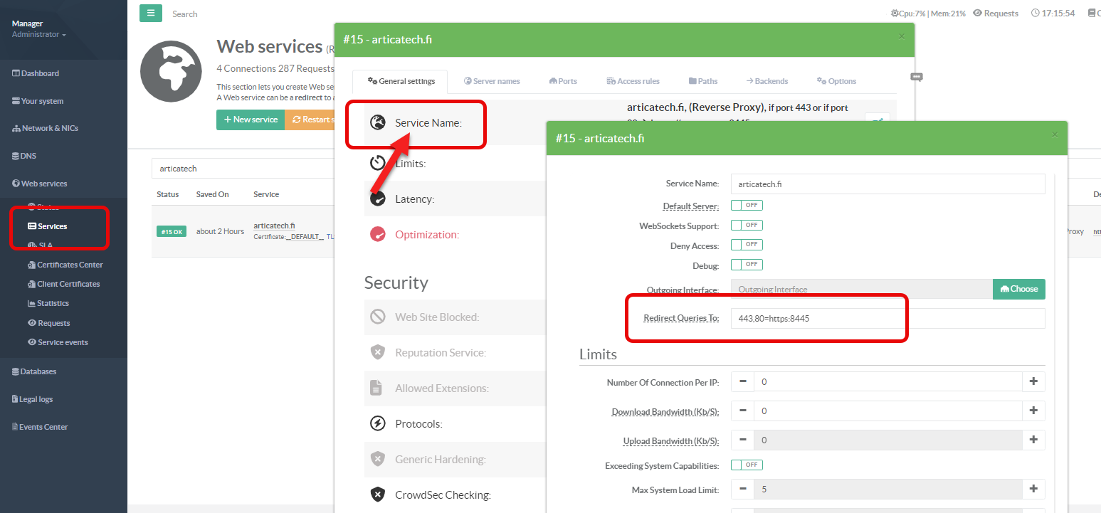 This process is known as port redirection.This feature is available on Artica v4.50 Service Pack 1 Hotfix 20250315-17 or Artica v4.50 Service Pack 2