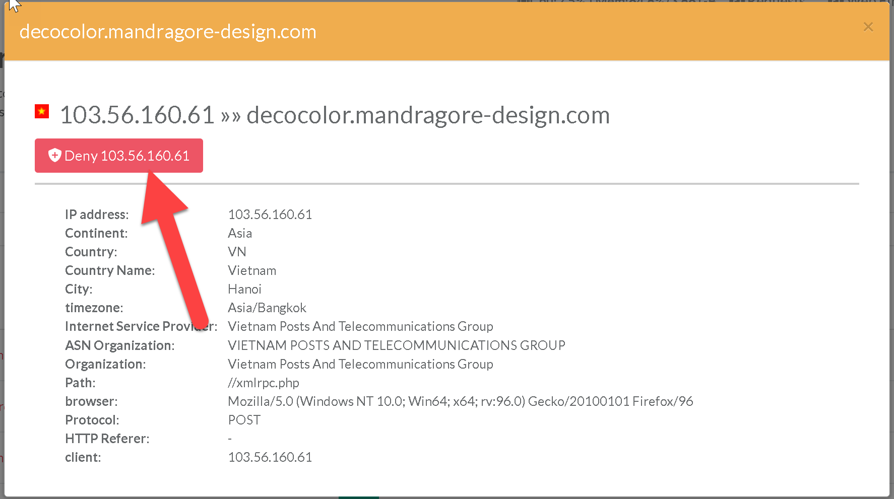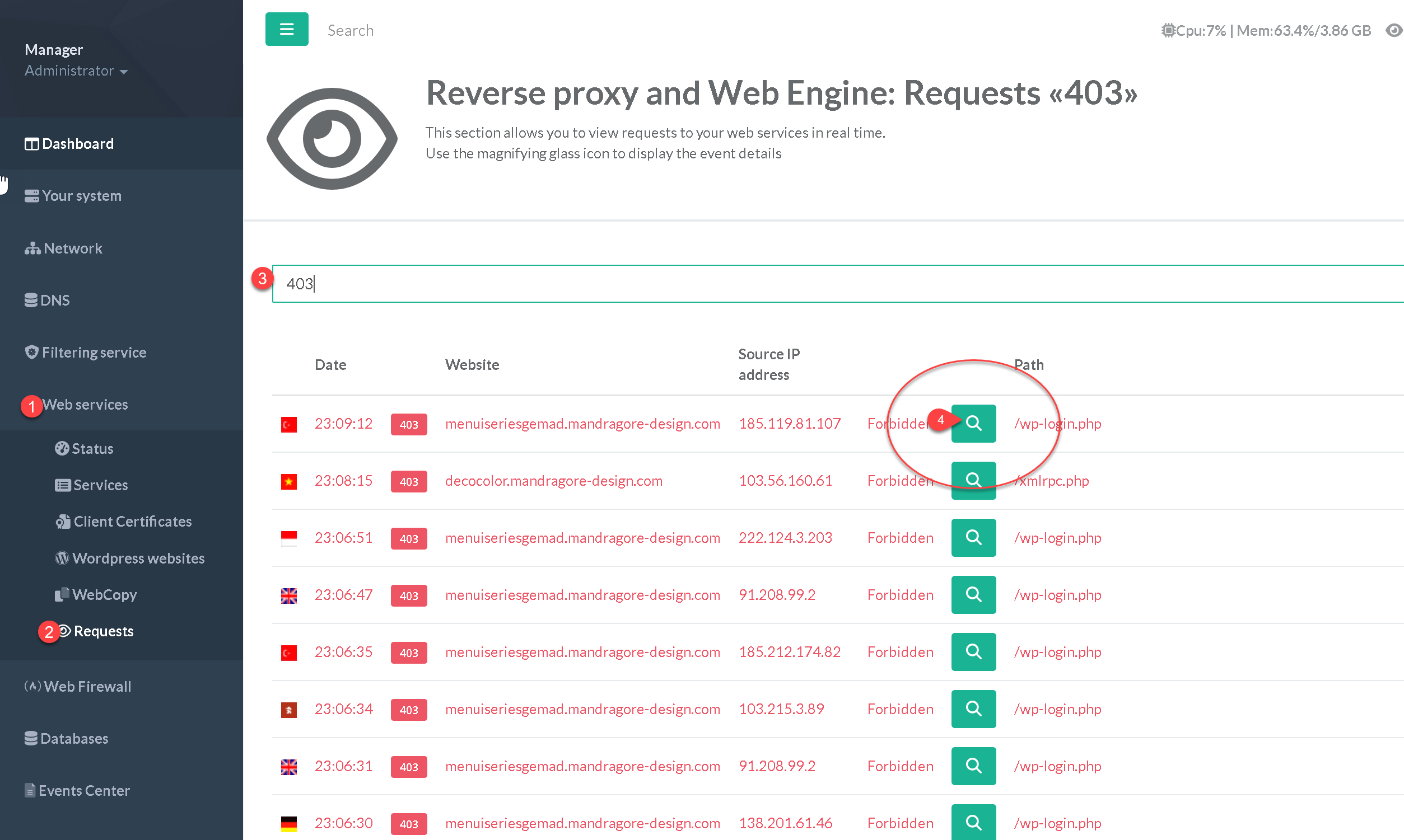 Through the real-time monitor and by selecting the request details, you can directly disallow an IP address that attempts to access your web server