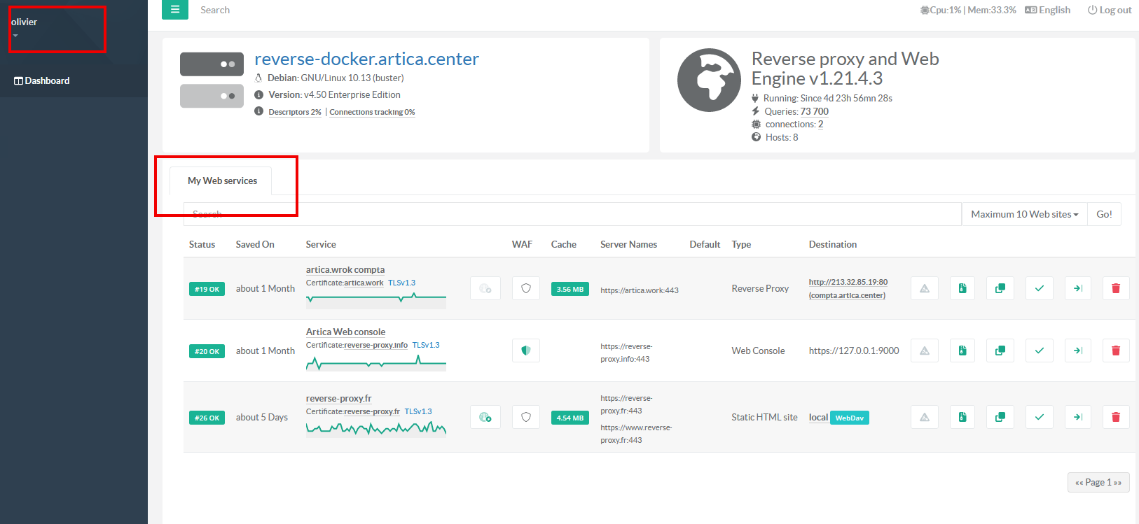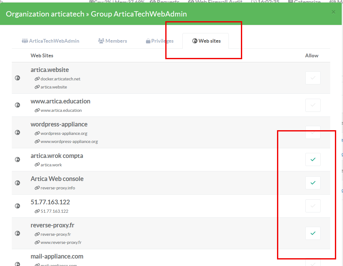 The WebMaster has full administration rights, so there's no point in limiting him to a list of sites.This feature is available on Artica v4.50 Service Pack 1 or 4.50 with the Hotfix 20240107-16