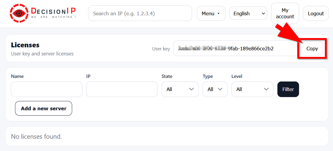 To retrieve your user key, you must register on the DecisionIP portal.