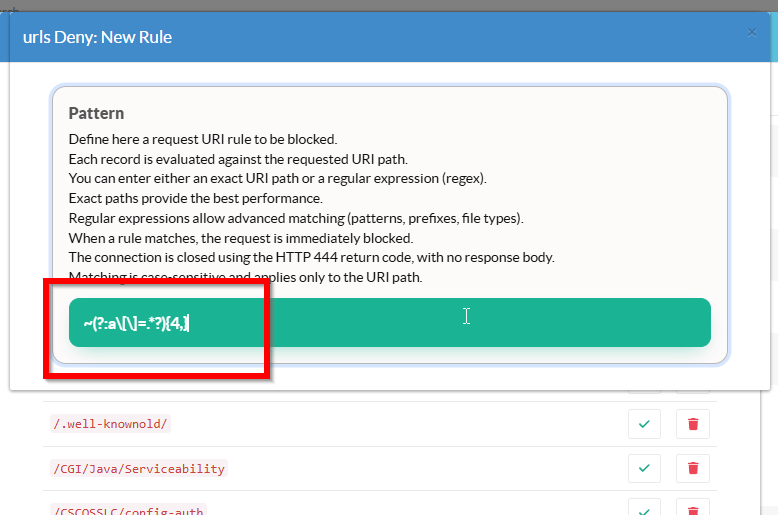 ~ means regex pattern(?: ... ) is a non-capturing group, used only for grouping, not for storing a match. a\[\]=Matches the literal string:a[]= The brackets are escaped because [ and ] are special in regex..*? Match anything after a[]= until the next possible match{4,} is a Repetition rule, means 4 or more times