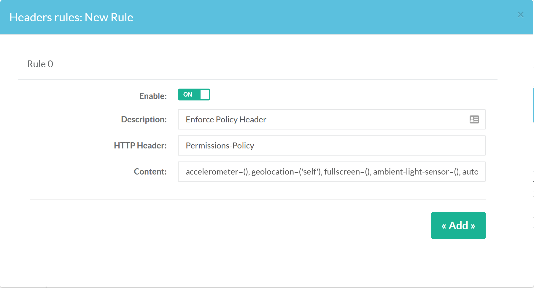 * to allow the feature, whatever its originself : to allow features only if they come from the same domainsrc : to define a source for which the feature is enabled() : to simply forbid the use of the featureAs a reminder, this header is able to to control (allow or restrict) browsers functionalities of the that take it into account when they serve the content of our site. The final goal here is obviously to avoid that useless functionalities for the site are exploited in a malicious way.