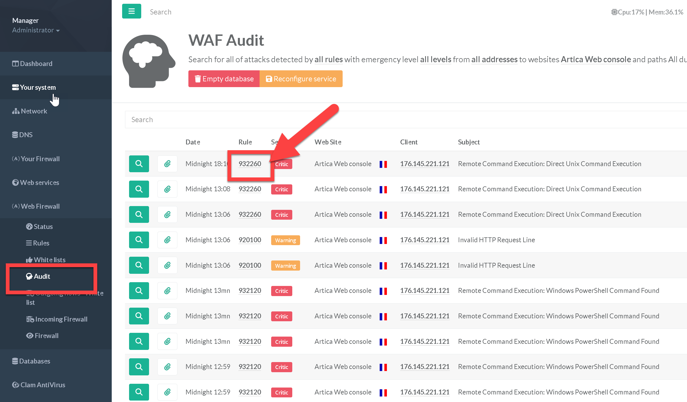In theWeb Firewall > Audityou can see blocked access according rules.