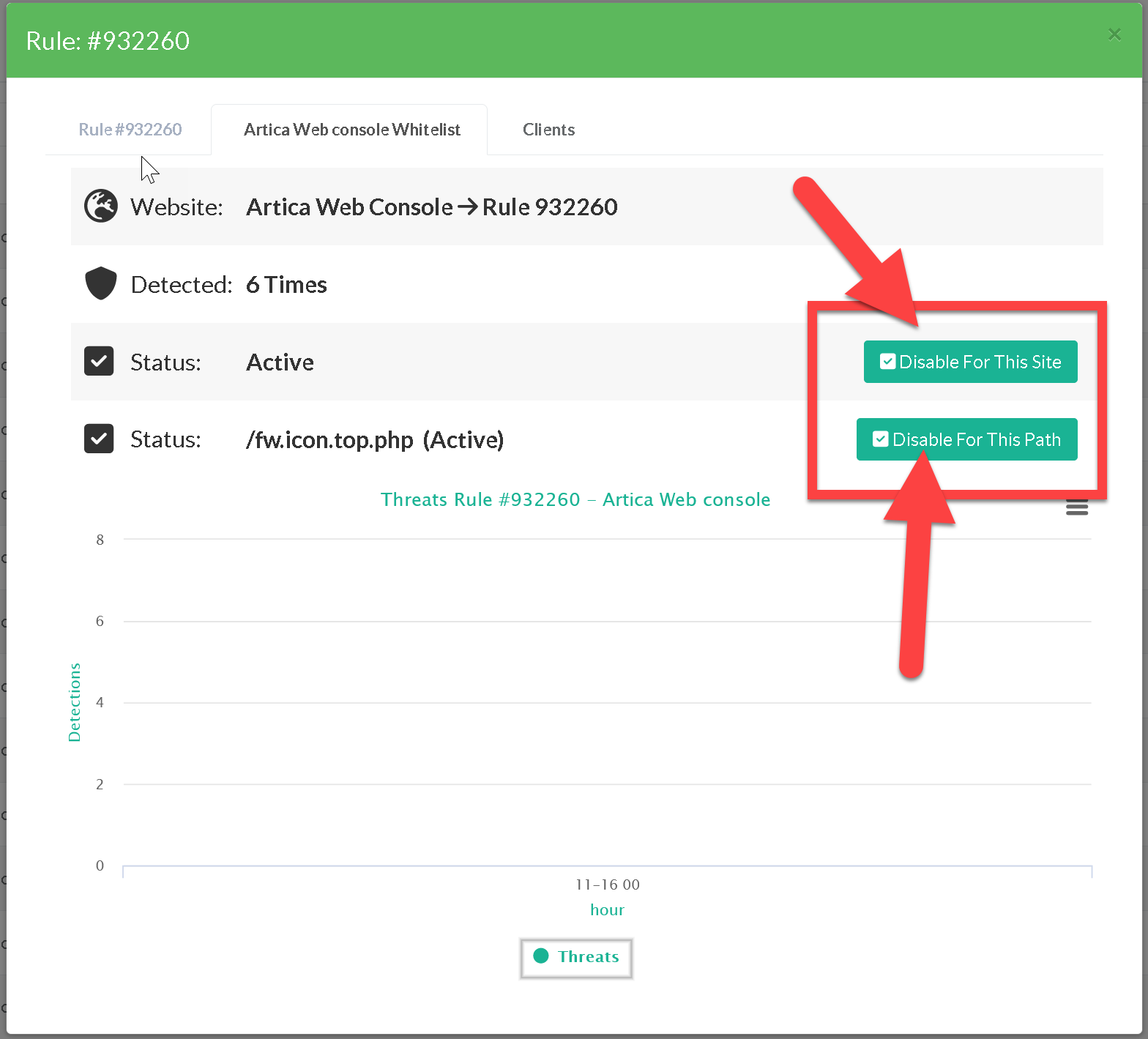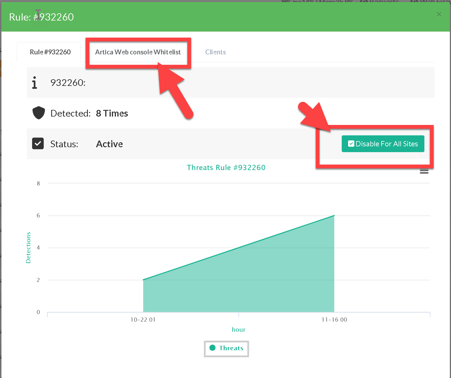 The first tab display the matched rule for all websites, the Button “Disable for All sites” allows to disable this rule for all websites that have the web firewall enabled
