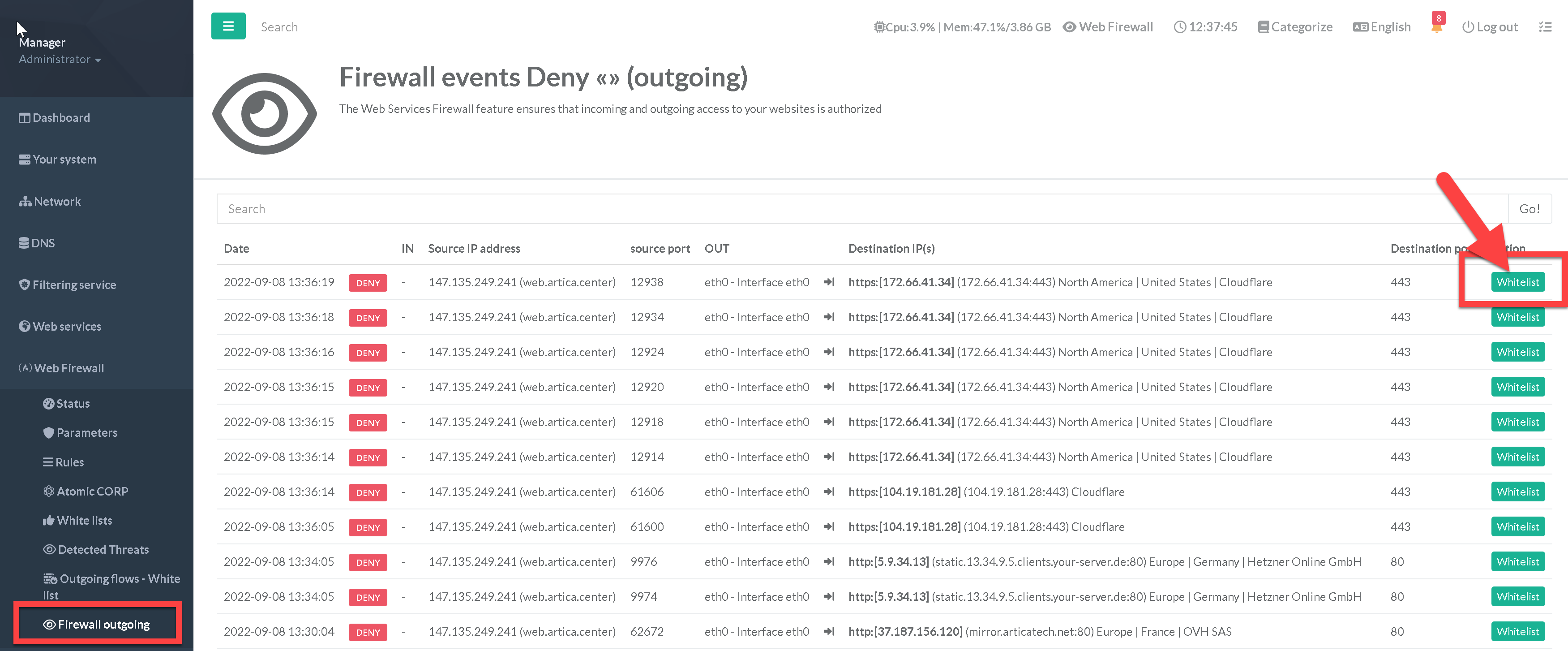 - A green “Whitelist” button allows you to add a whitelist rule in order to let your Web server engine to be connected to the target address and port.