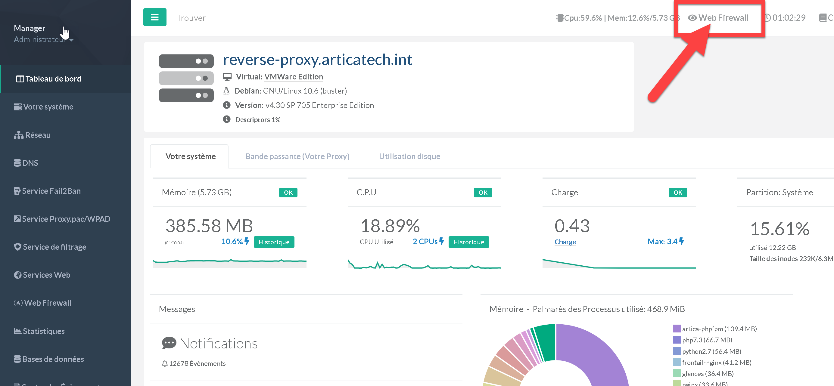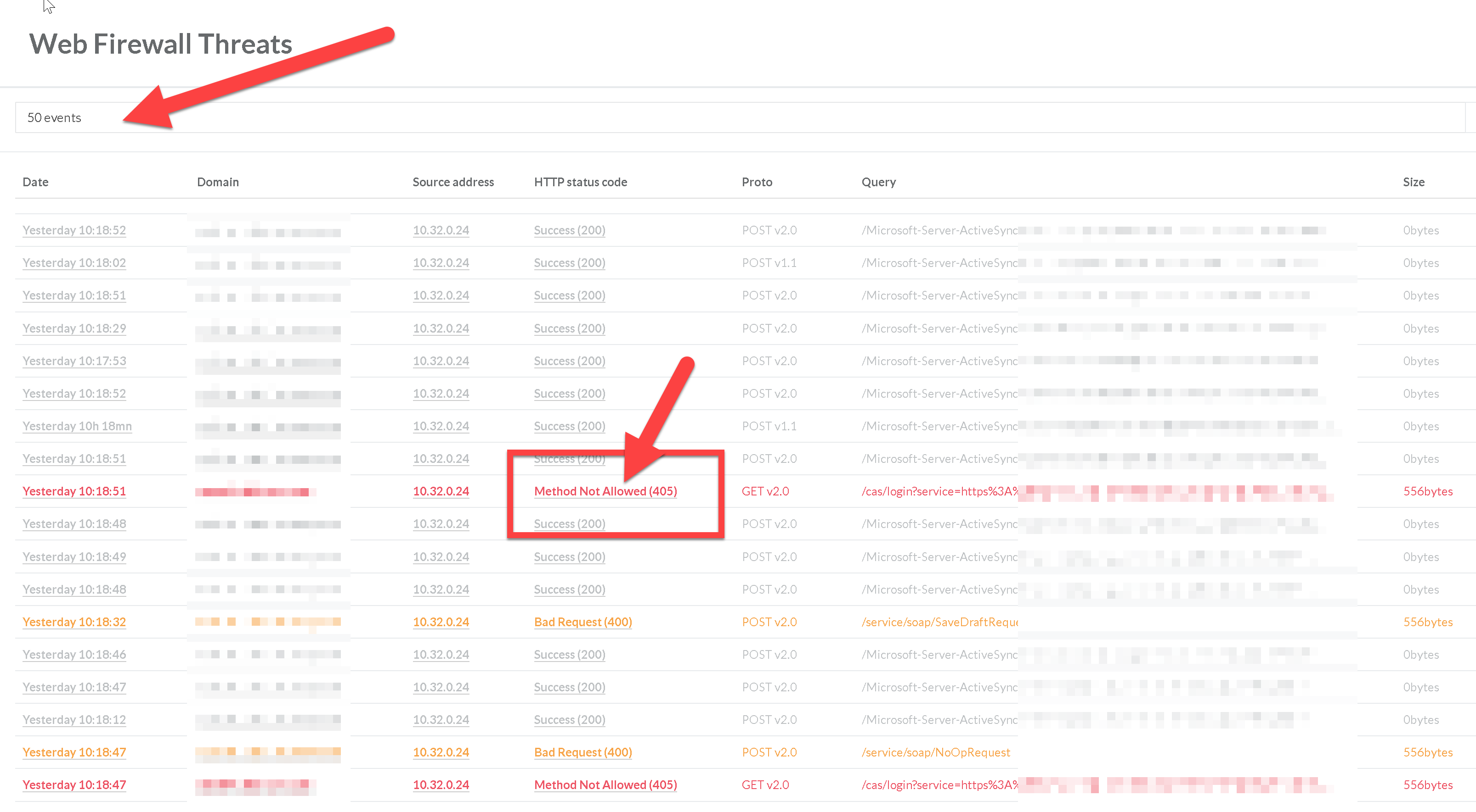 A table shows you in real time the requests that pass through the firewall. In red, events that correspond to HTTP rejection codes from the protection service.