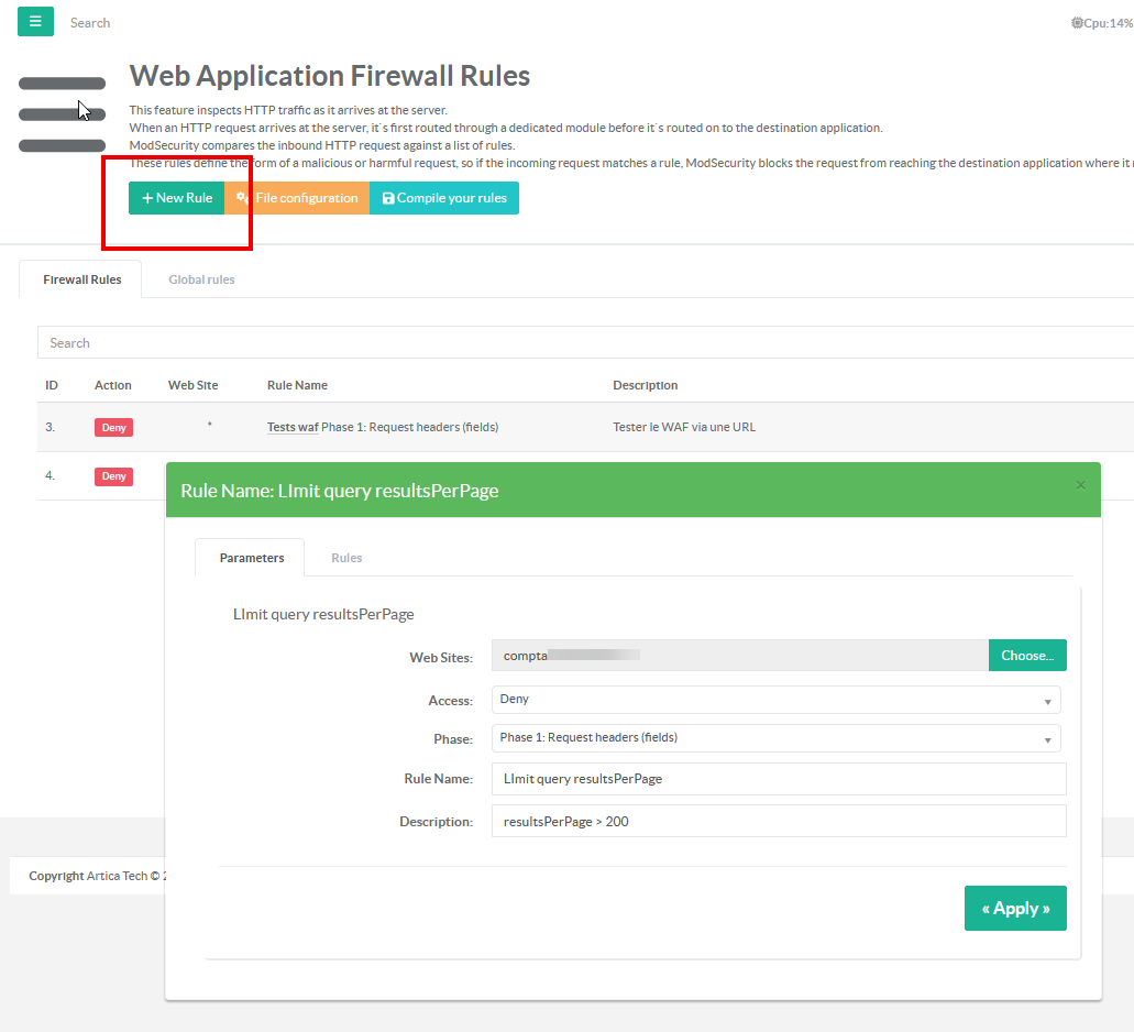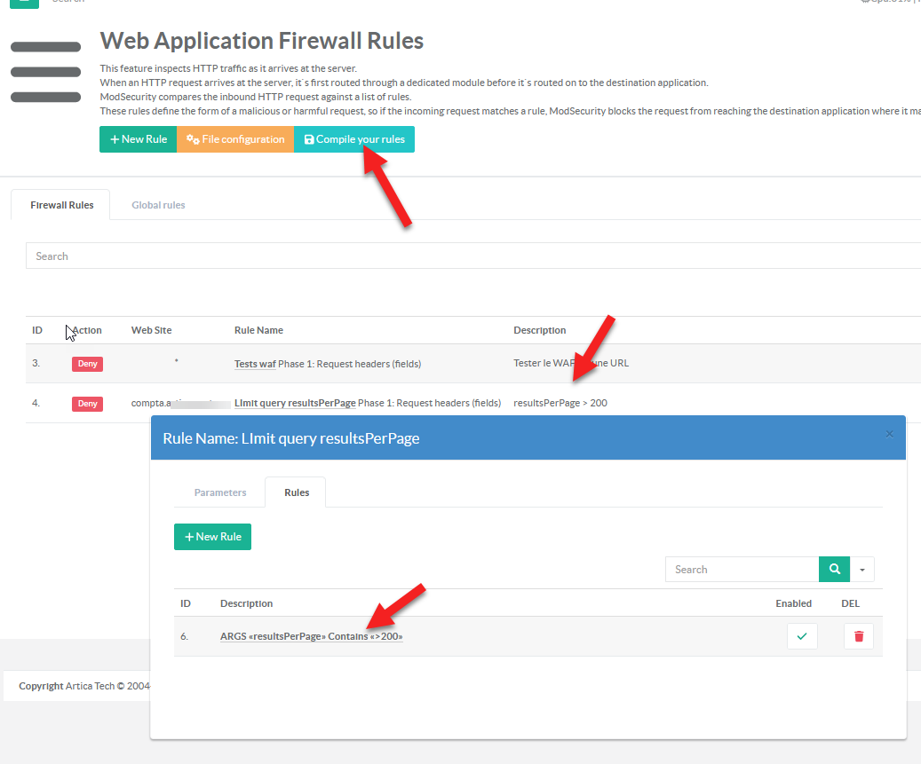 In the left menu to the Web Firewall > Rules, create a new rule that Deny accesses