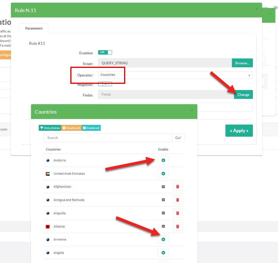 Operator” option, choose “Countries”Change” under the “Fields” field