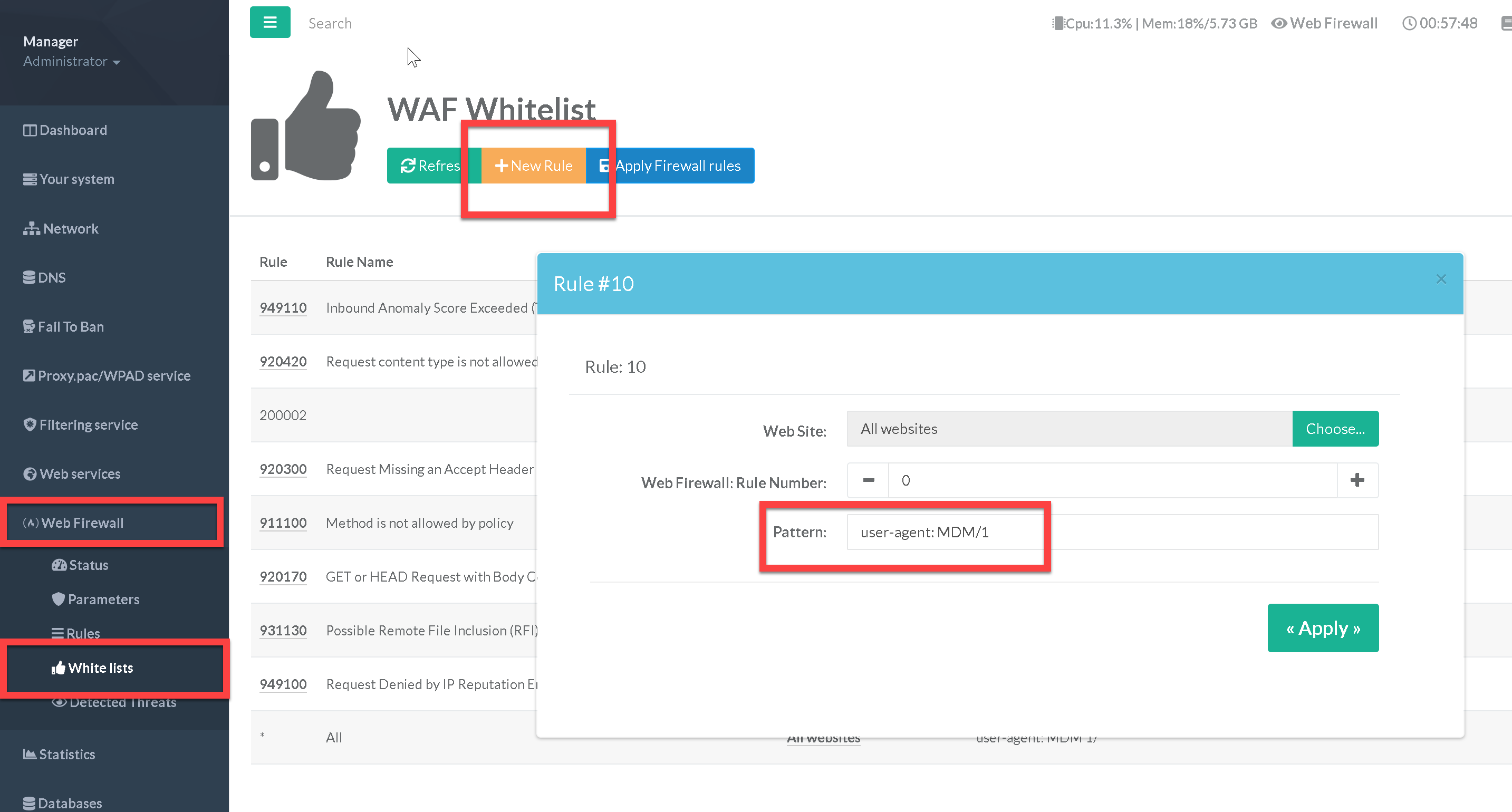 Under pattern add the string that can be matched in the User-Agent string: In our example, we want to whitelist all versions of MDM so MDM/1 is correct, it will matches *MDM/1* Add the prefix “User-Agent:” in order to let Artica understand that you need to matches inside the User-Agent header instead of the URL : User-Agent: MDM/1