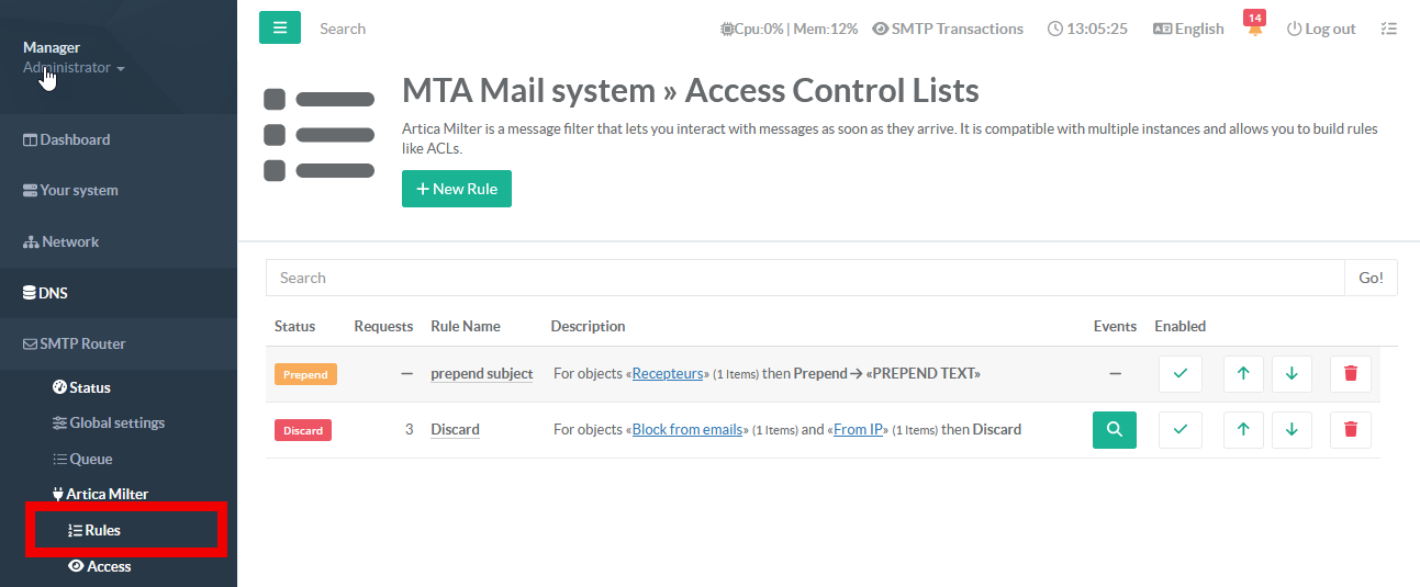 Let's say we want to modify the subject of a certain type of message, the message will pass through the Prepend rule.