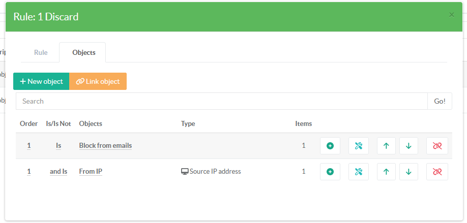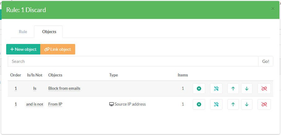 In the example below, a message will be silently rejected if and only if the message corresponds to one of the records belonging to the two objects "Block from emails" and "From IP".