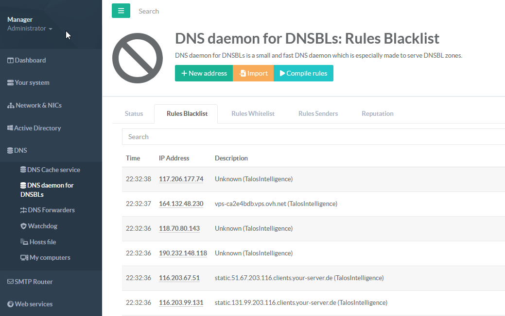 The “New address” button allows you to add a single IP address, if you need to copy/paste several records, use the Import button