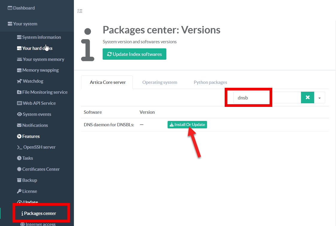 Your System > Update > Packages center”dnsblInstall Or Update button on the DNS Daemon for DNSBLs