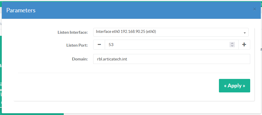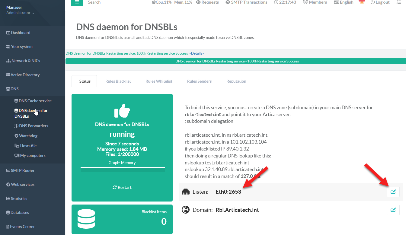 To build this service, you must create a DNS zone (subdomain) in your main DNS server for rbl.yourdomain.tld and point it to your Artica server.
