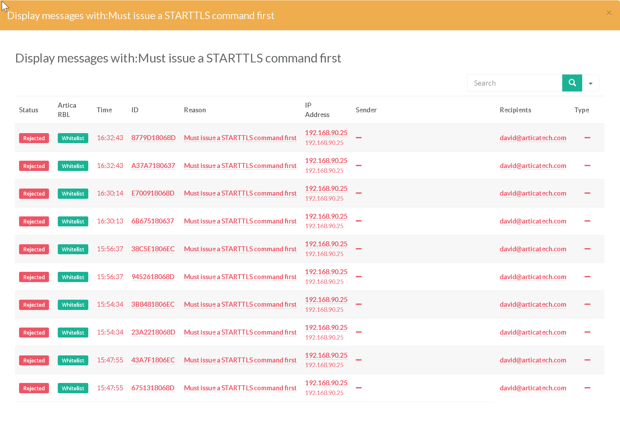 Each time, you artica SMTP server try to relay it was refused with the error “Must issue a STARTTLS command first”