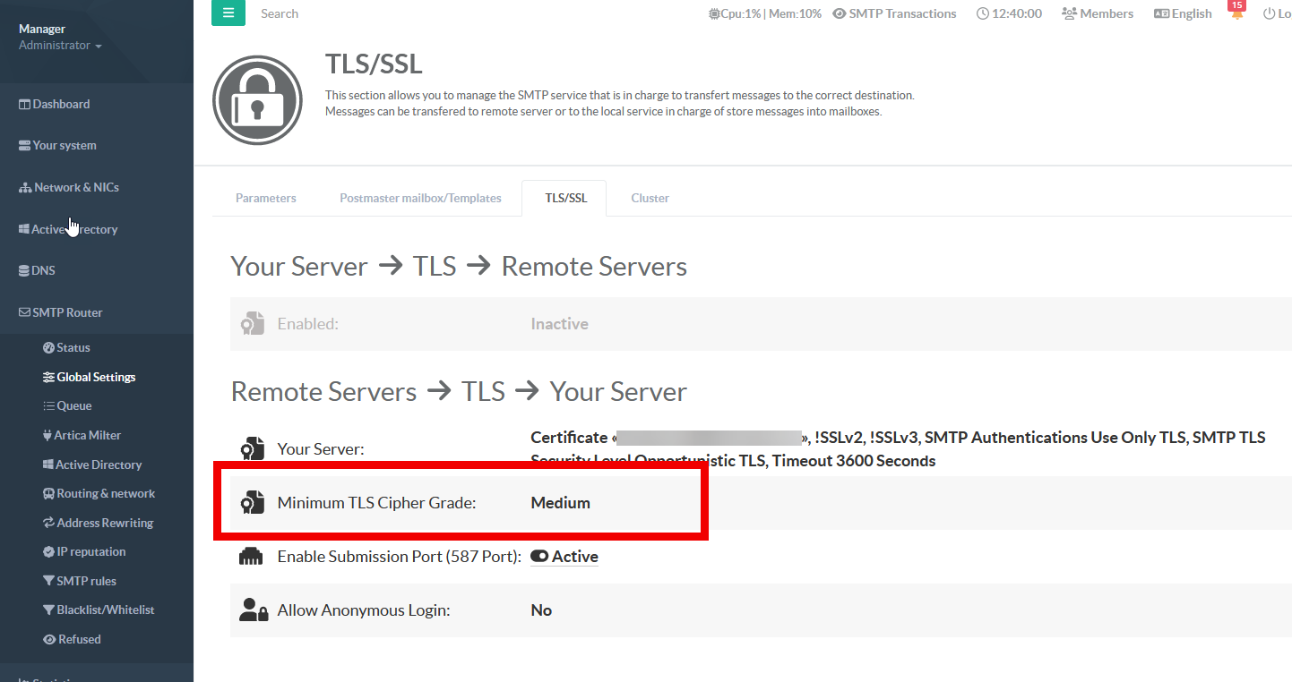 You can add an additional list of ciphers or cipher types to be excluded from the SMTP server's list of ciphers at mandatory TLS security levels inside the “List of ciphers or cipher types to exclude” field