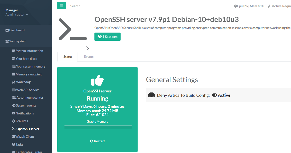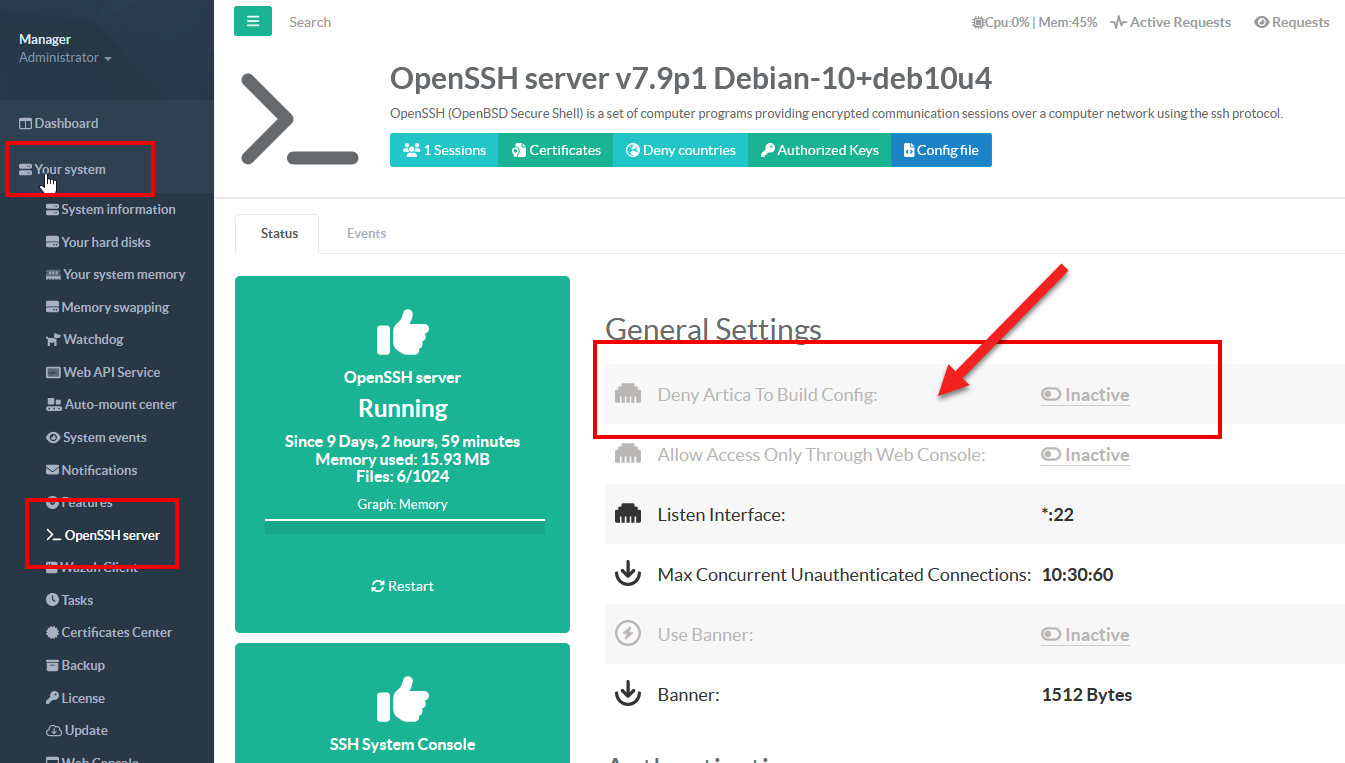 On Your System > OpenSSH server click on the “Deny Artica to build config” link