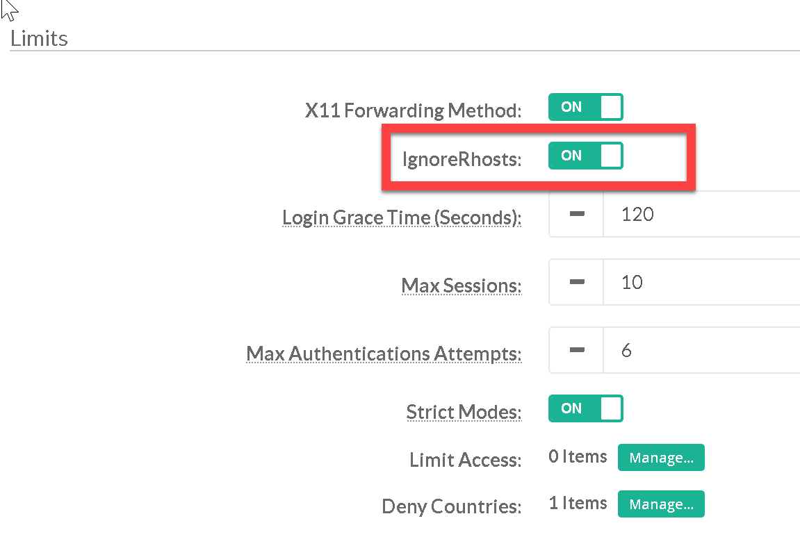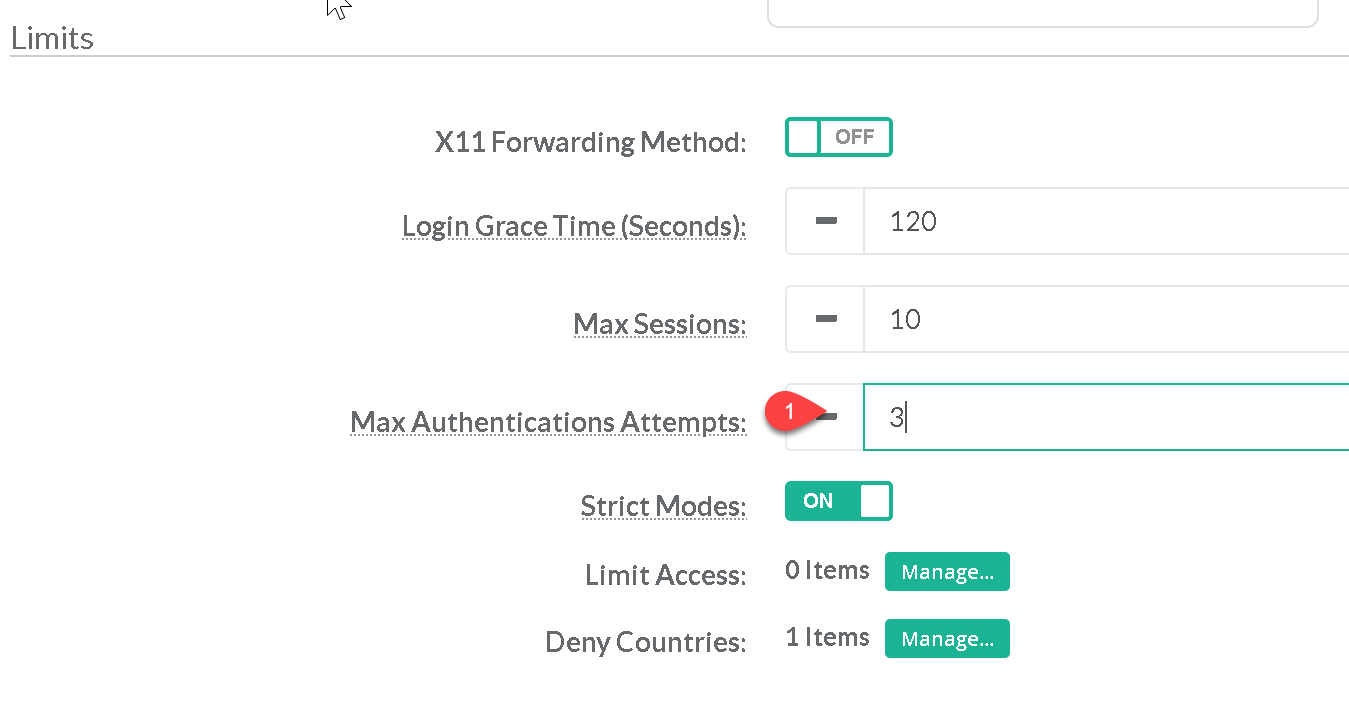 The Max authentications attempts parameter specifies the maximum number of authentication attempts permitted per connection. When the login failure count reaches half the number; error messages will be written to the syslog file detailing the login failure. Setting the Max authentications attempts parameter to a low number will minimize the risk of successful brute force attacks to the SSH server. |