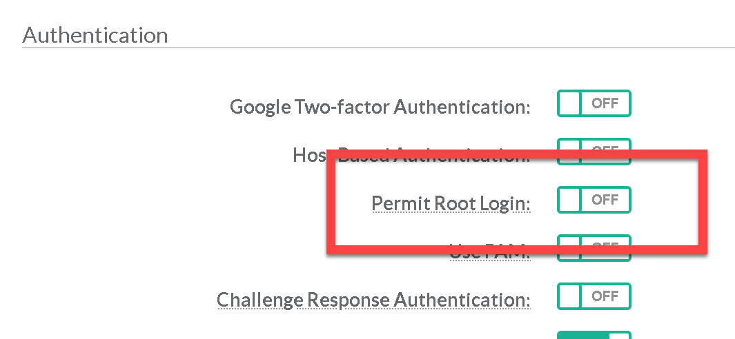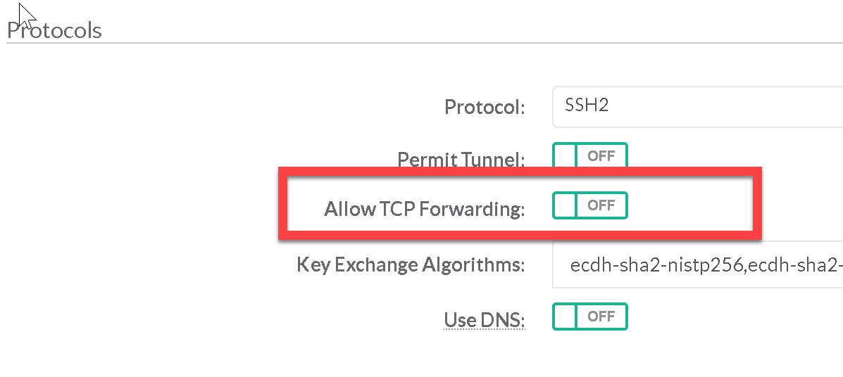 SSH port forwarding is a mechanism in SSH for tunneling application ports from the client to the server; or servers to clients. It can be used for adding encryption to legacy applications; going through firewalls; and some system administrators and IT professionals use it for opening backdoors into the internal network from their home machines. Leaving port forwarding enabled can expose the organization to security risks and back-doors. Ensure Allow TCP Forwarding is set to OFF |