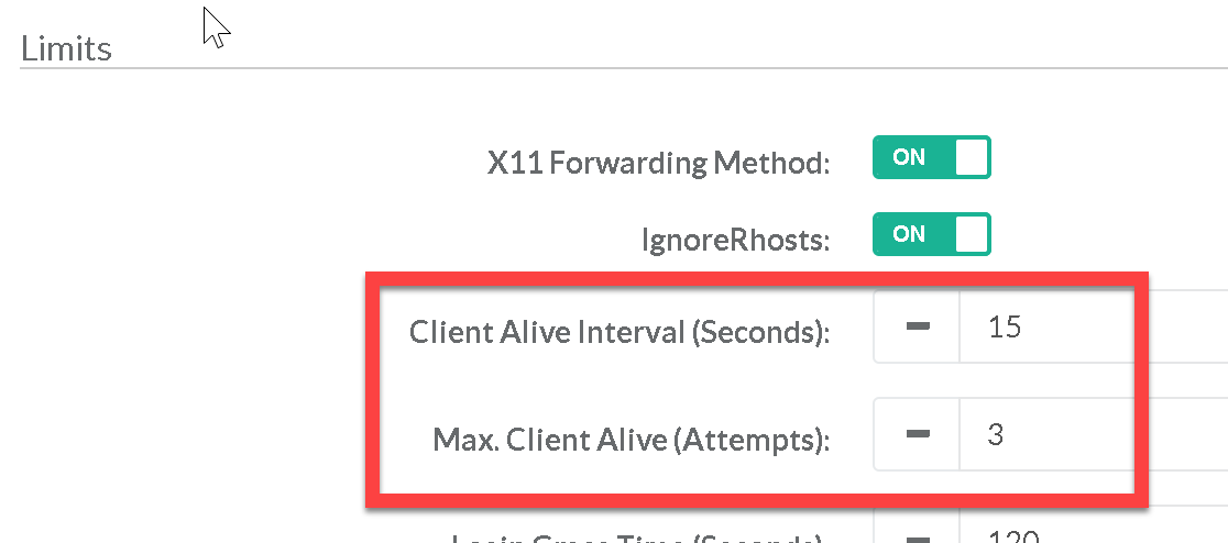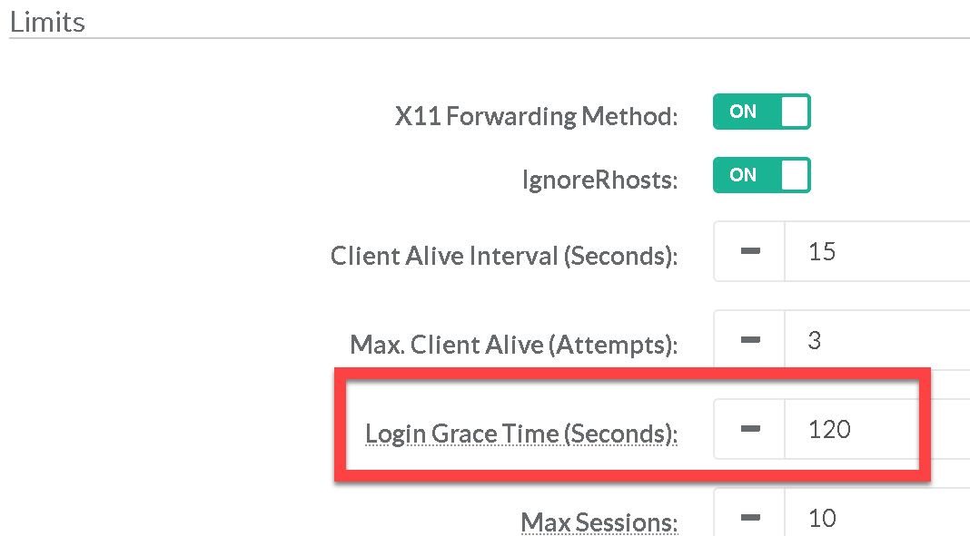 The Login Grace Time parameter specifies the time allowed for successful authentication to the SSH server. Like other session controls in this session the Grace Period should be limited to appropriate organizational limits to ensure the service is available for needed access. Ensure the Login Grace Time is set to one minute or less