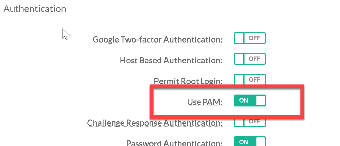 Use PAM Enables the Pluggable Authentication Module interface. When use PAM is active; PAM runs through account and session types properly. |