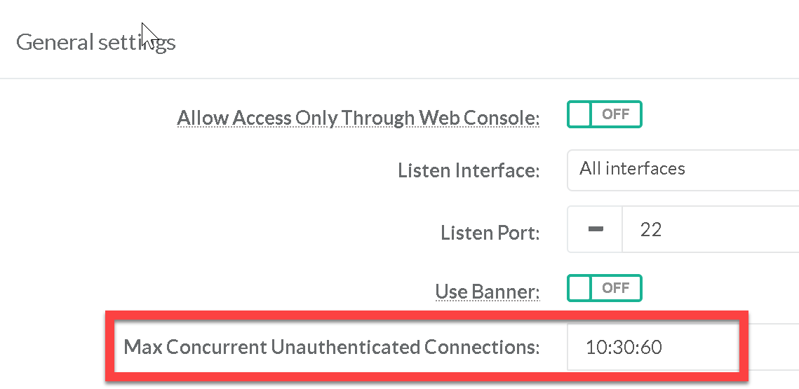 The Max concurrent unauthenticated connections parameter specifies the maximum number of concurrent unauthenticated connections to the SSH daemon. To protect a system from denial of service due to a large number of pending authentication connection attempts; use the rate limiting function of Max concurrent unauthenticated connections to protect availability of sshd logins and prevent overwhelming the daemon. Ensure SSH Max concurrent unauthenticated connections is limited |