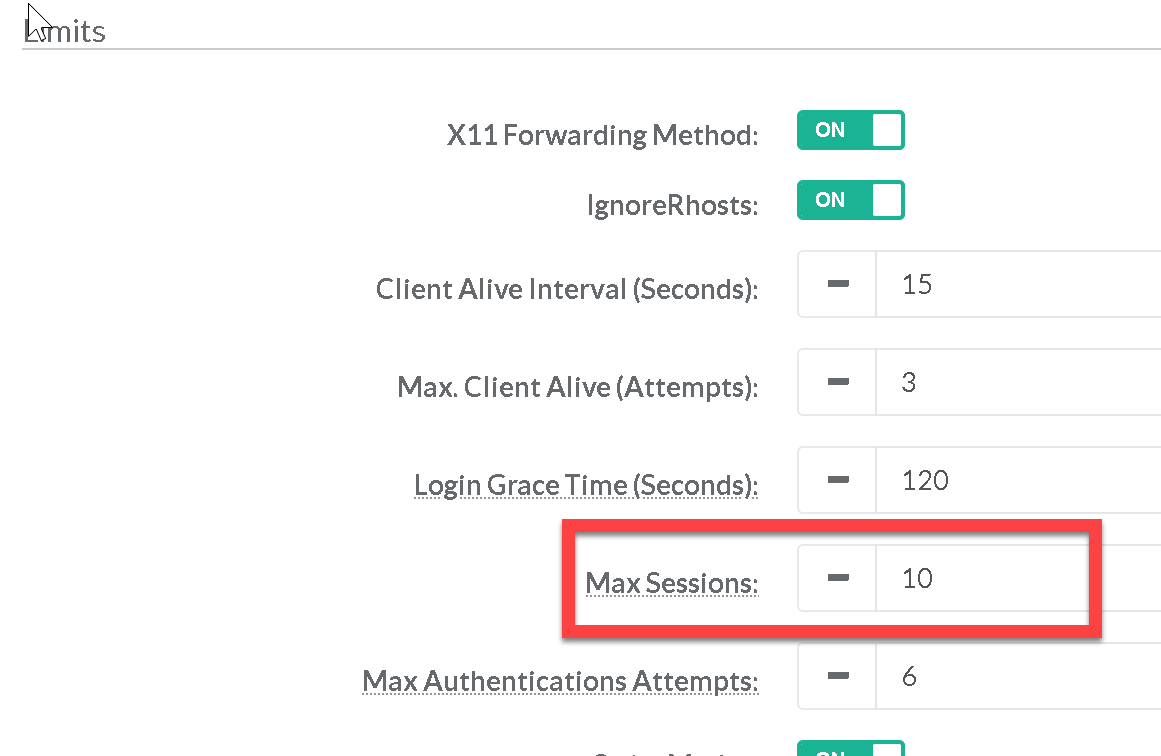 The Max Sessions parameter specifies the maximum number of open sessions permitted from a given connection. To protect a system from denial of service due to a large number of concurrent sessions; use the rate limiting function of Max Sessions to protect availability of sshd logins and prevent overwhelming the daemon. |