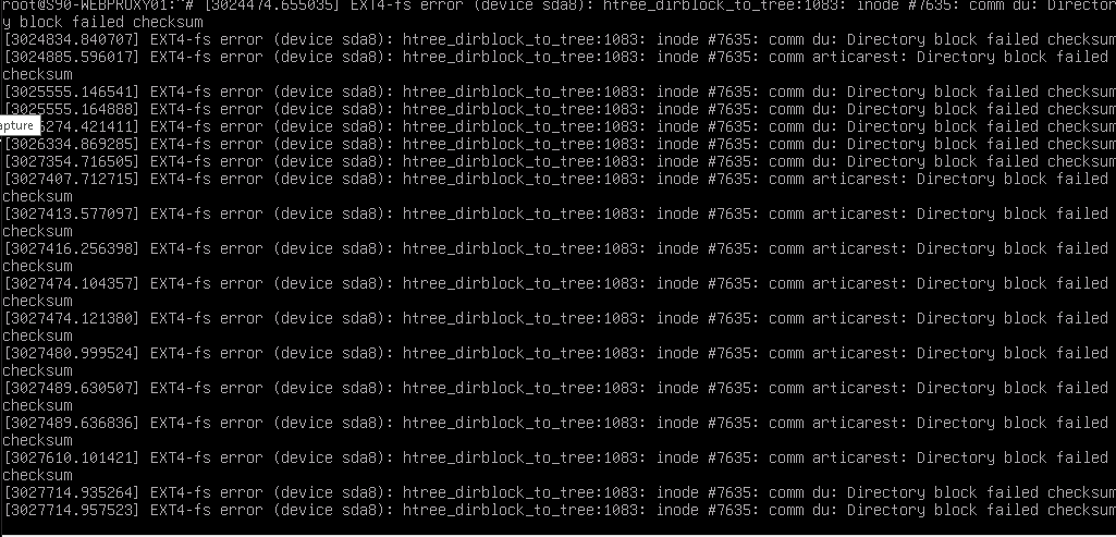 EXT4-fs error (device sda8): htree_dirblock_to_tree:1083: inode #7635: comm articarest: Directory block failed checksum