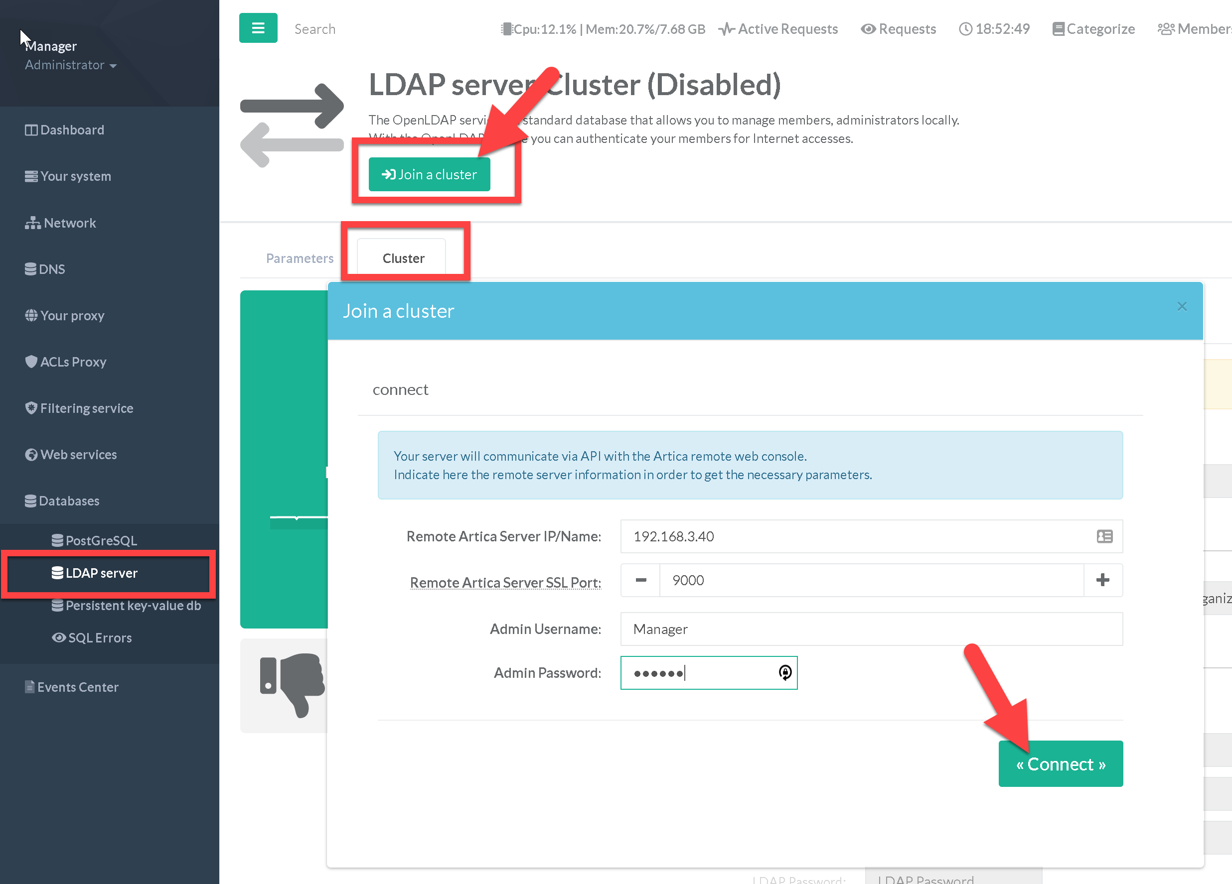 Set the Artica administrator credentials ( such as Manager or any account with administrator privileges )