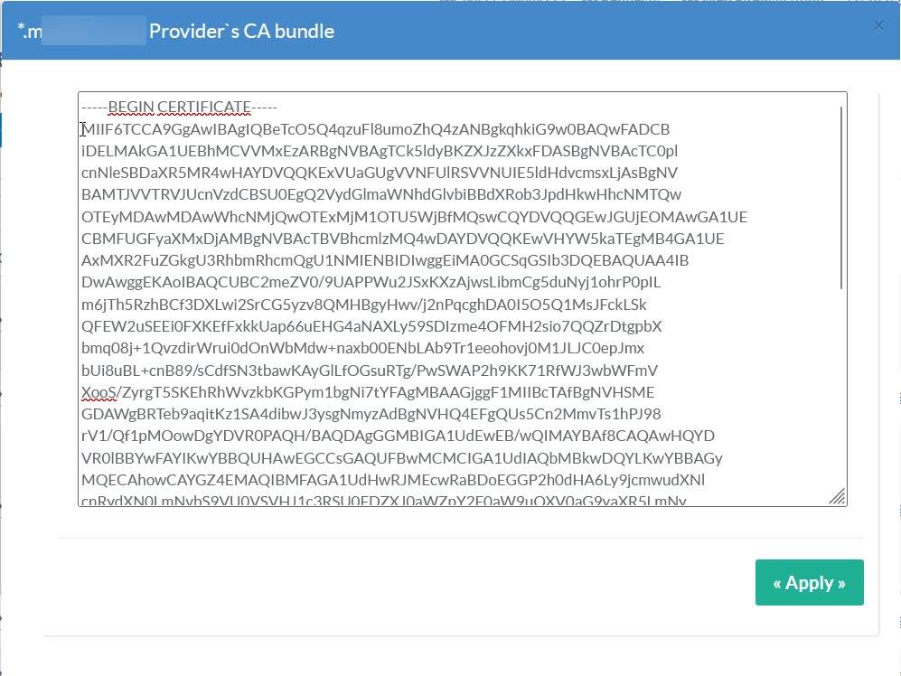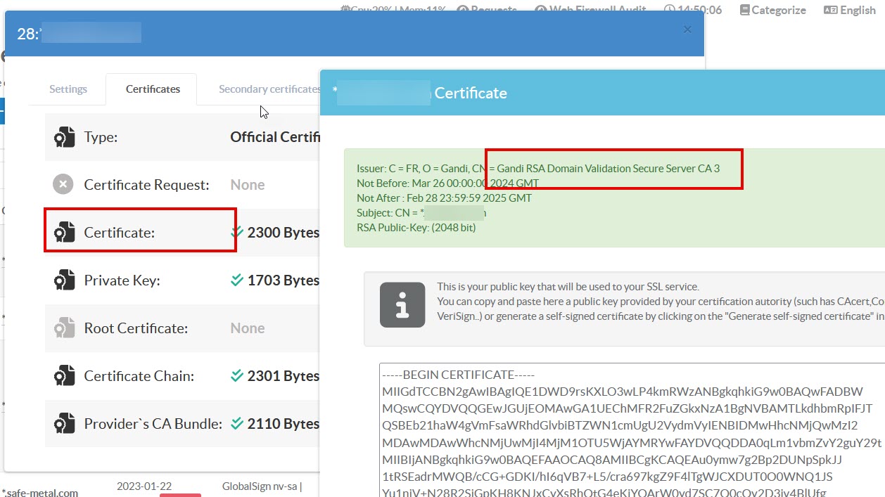 In our example, the certificate field contains the Gandi certificate instead of the certificate generated for your site (it's in the Bundle section).