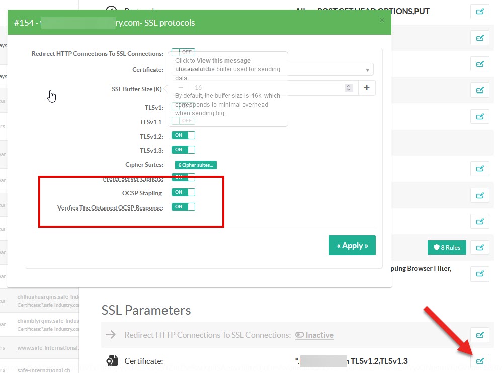On the reverse-proxy section, go to your Web sites rules and select the SSL parameters.
