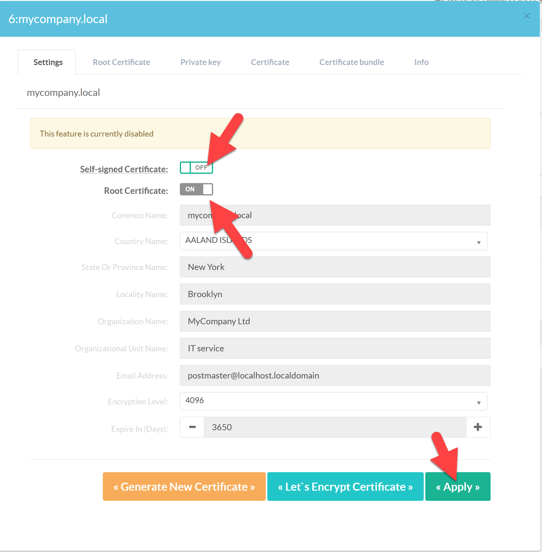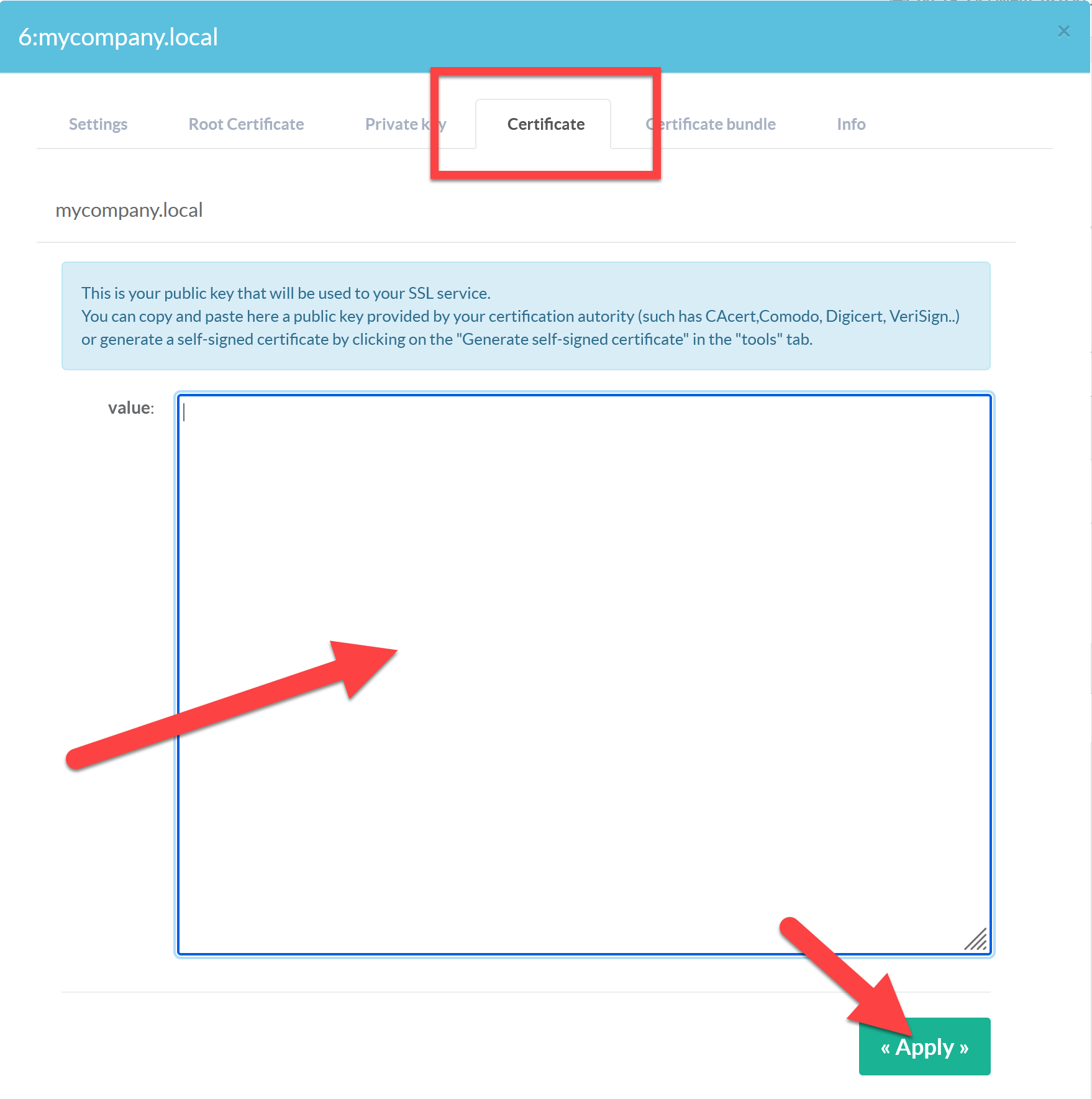 - Open the Certificate tab and Copy past the content of the certificate file inside the textarea
