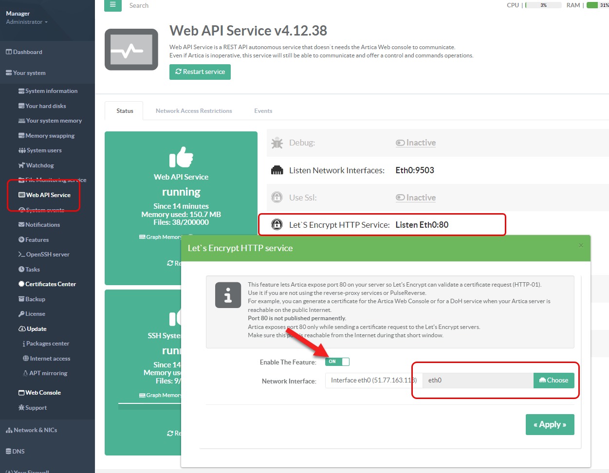 This feature lets Artica expose port 80 on your server so Let’s Encrypt can validate a certificate request (HTTP-01).