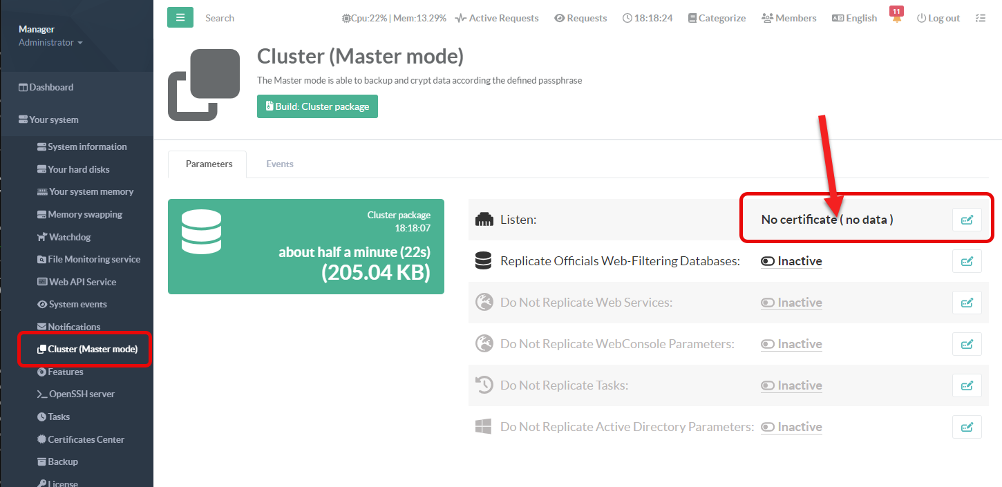 Your system > Cluster ( master mode )No certificate ( no data )”
