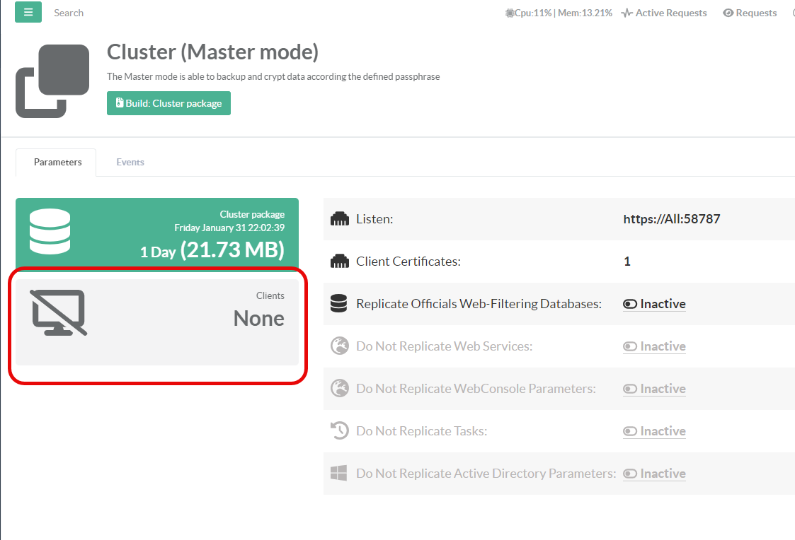 If no client is connected, a gray widget is displayed, indicating that no client has tried to synchronize through your master server.