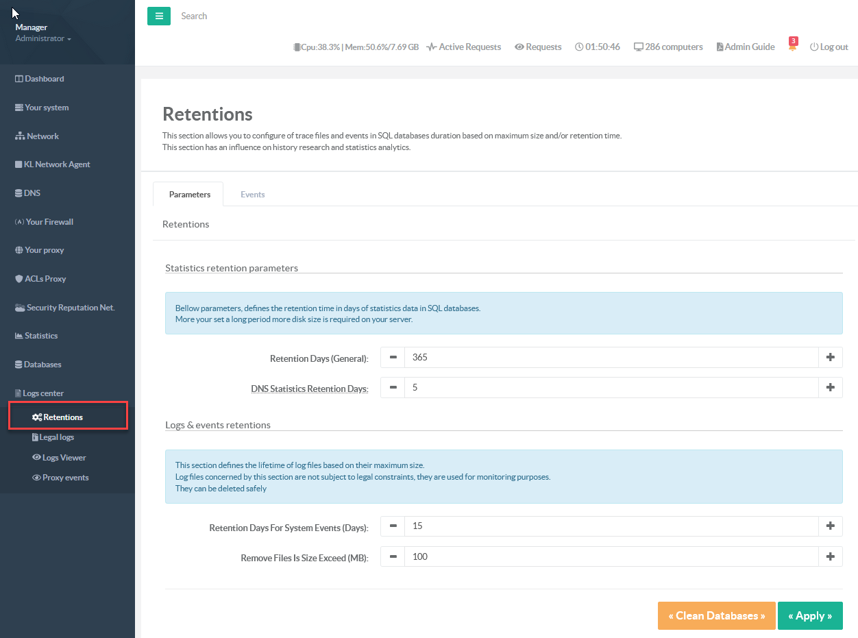 The section “Logs Center” / Retentions allows you to define the time to live of statistics and log files.