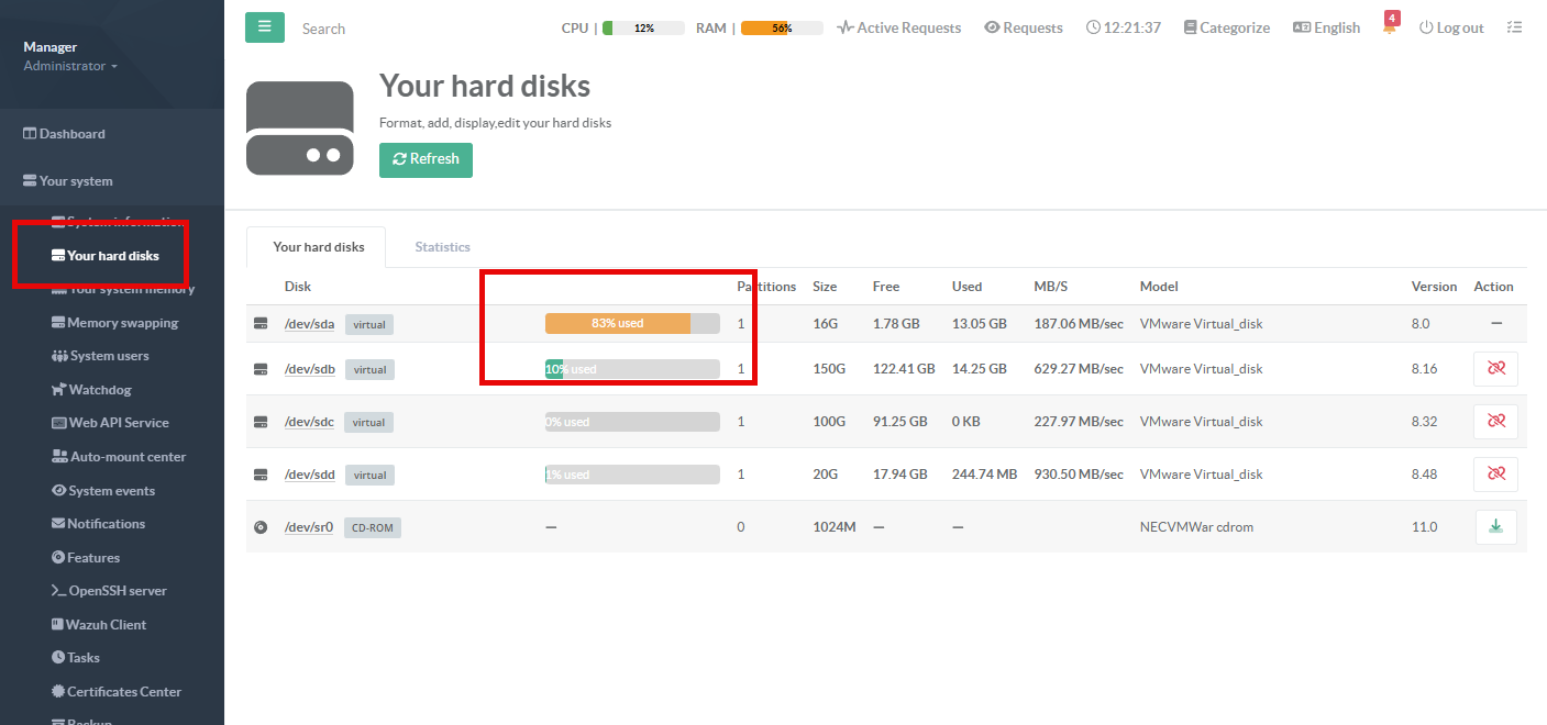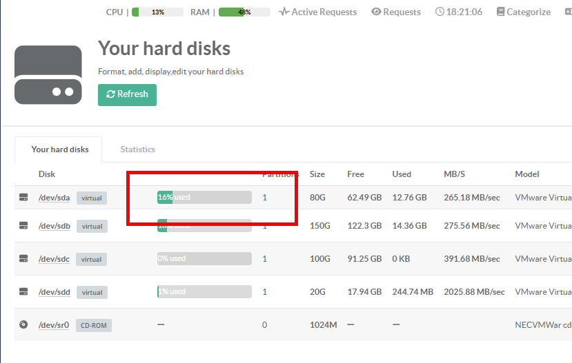 You’ll notice an inconsistency: although the disk now shows the updated size, utilization remains high. This is because Artica sees the physical disk size but still maps it to your current partition sizes.