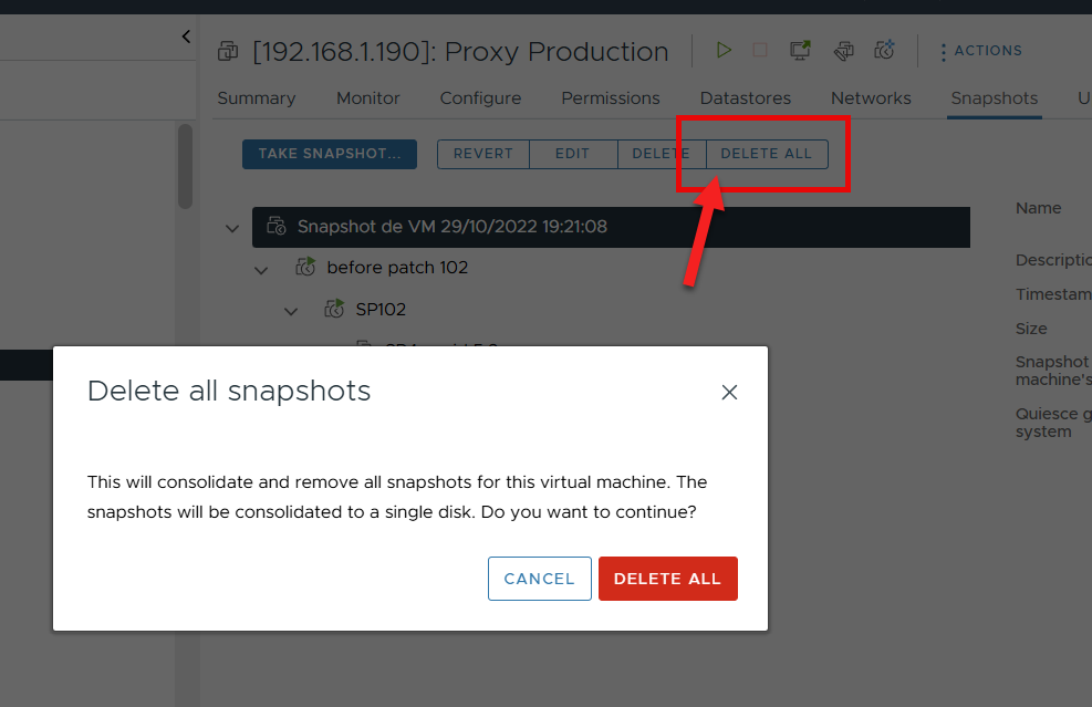 Delete all snapshots associated with the Virtual machine ( it should take times - depends on your snapshots size )