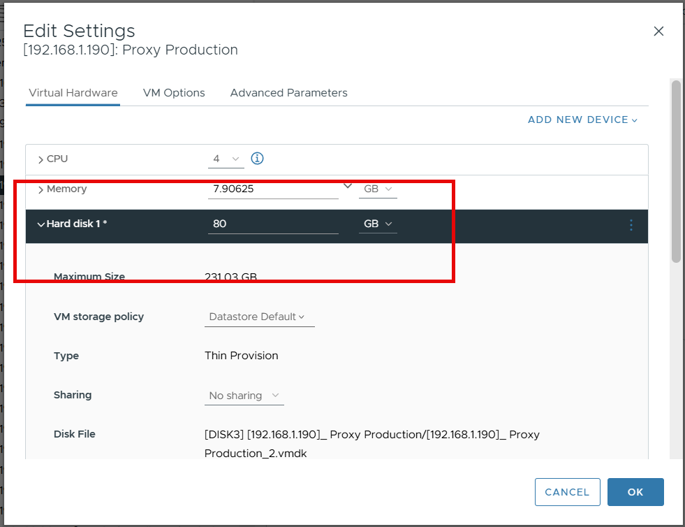 If the disks are clustered, they cannot be expanded through vSphere Client but instead through CLI. Use this command as an example: vmkfstools -X 80G -d eagerzeroedthick vm.vmdk Where eagerzeroedthick Allocates and zeroes all blocks immediately when created or extended.