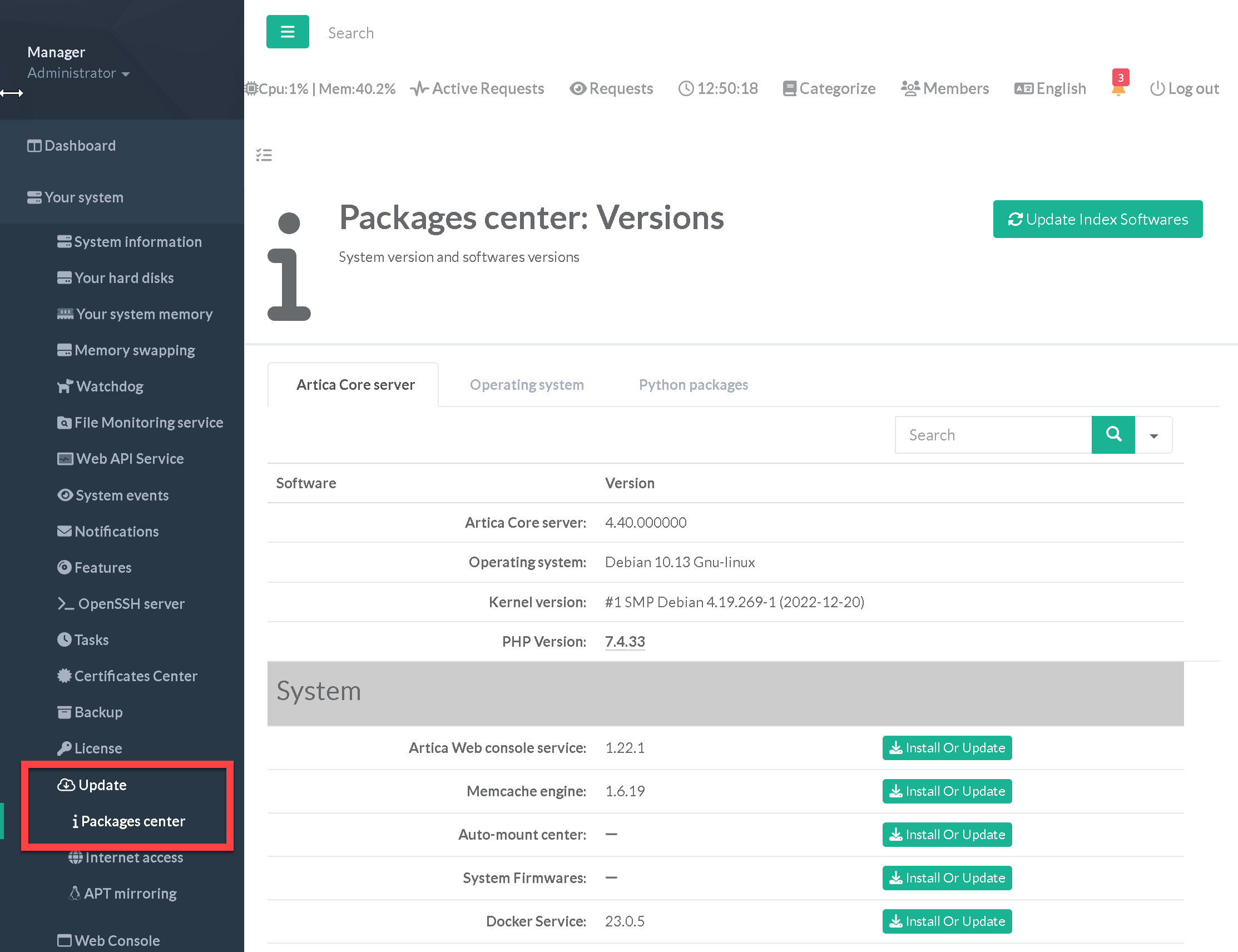 In this case, if you want to place the software on the system disk, refer to the Packages Center section to authorize Artica to download the software.