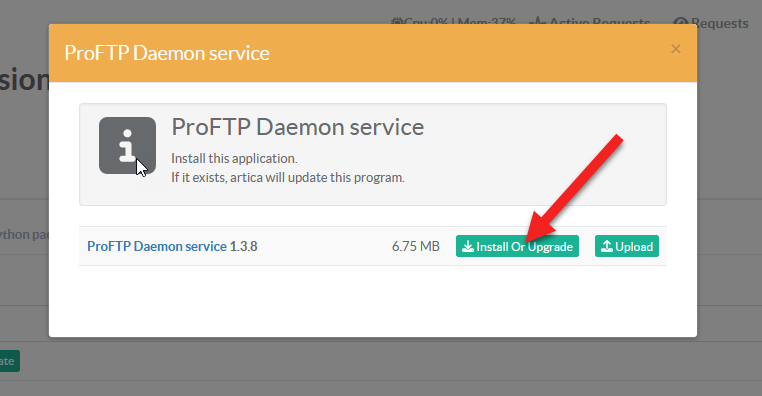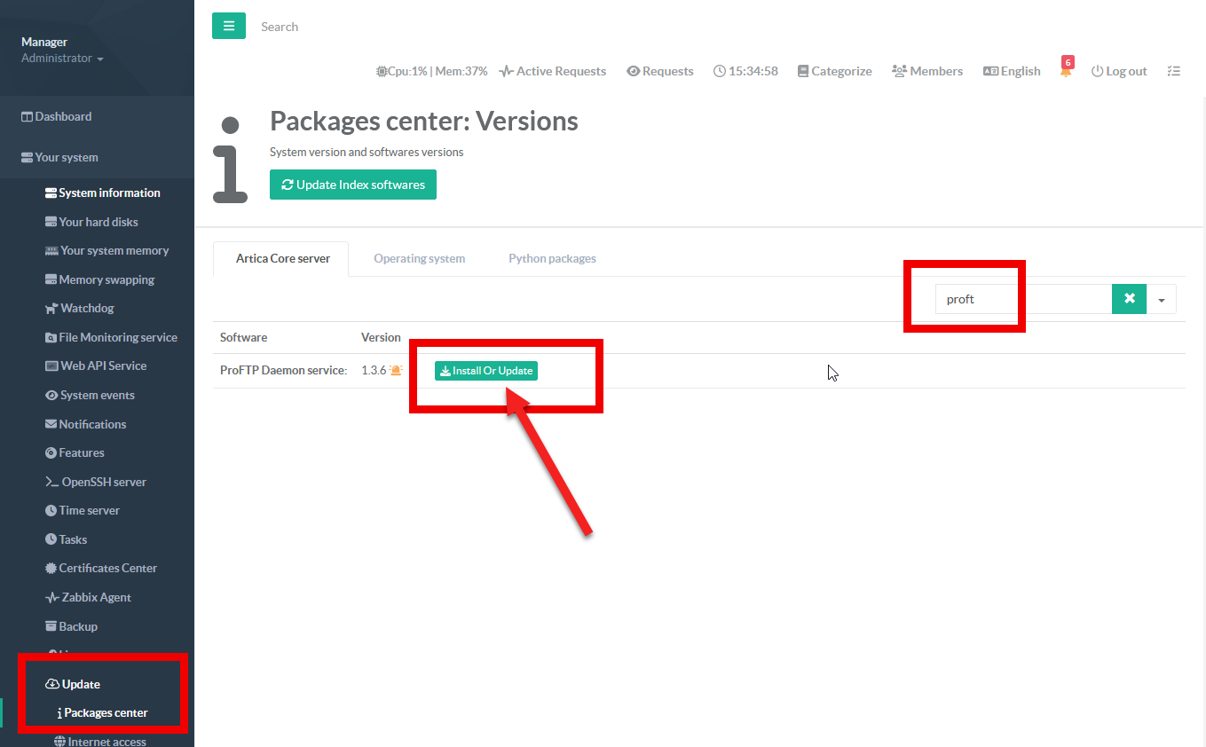 Your System > Update > Packages center”Install Or Update button under the ProFTP Daemon service row