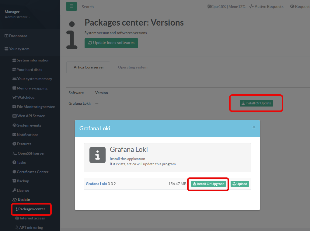 Use the update section to place libraries and binaries on the disk of your Artica server.