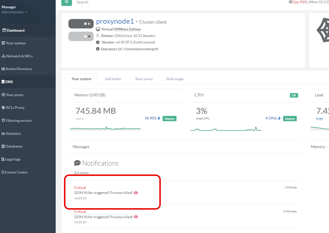 When Artica detect the OOM-Killer execution, an alert “OOM-Killer triggered! Process Killed !” is generated in the system events.