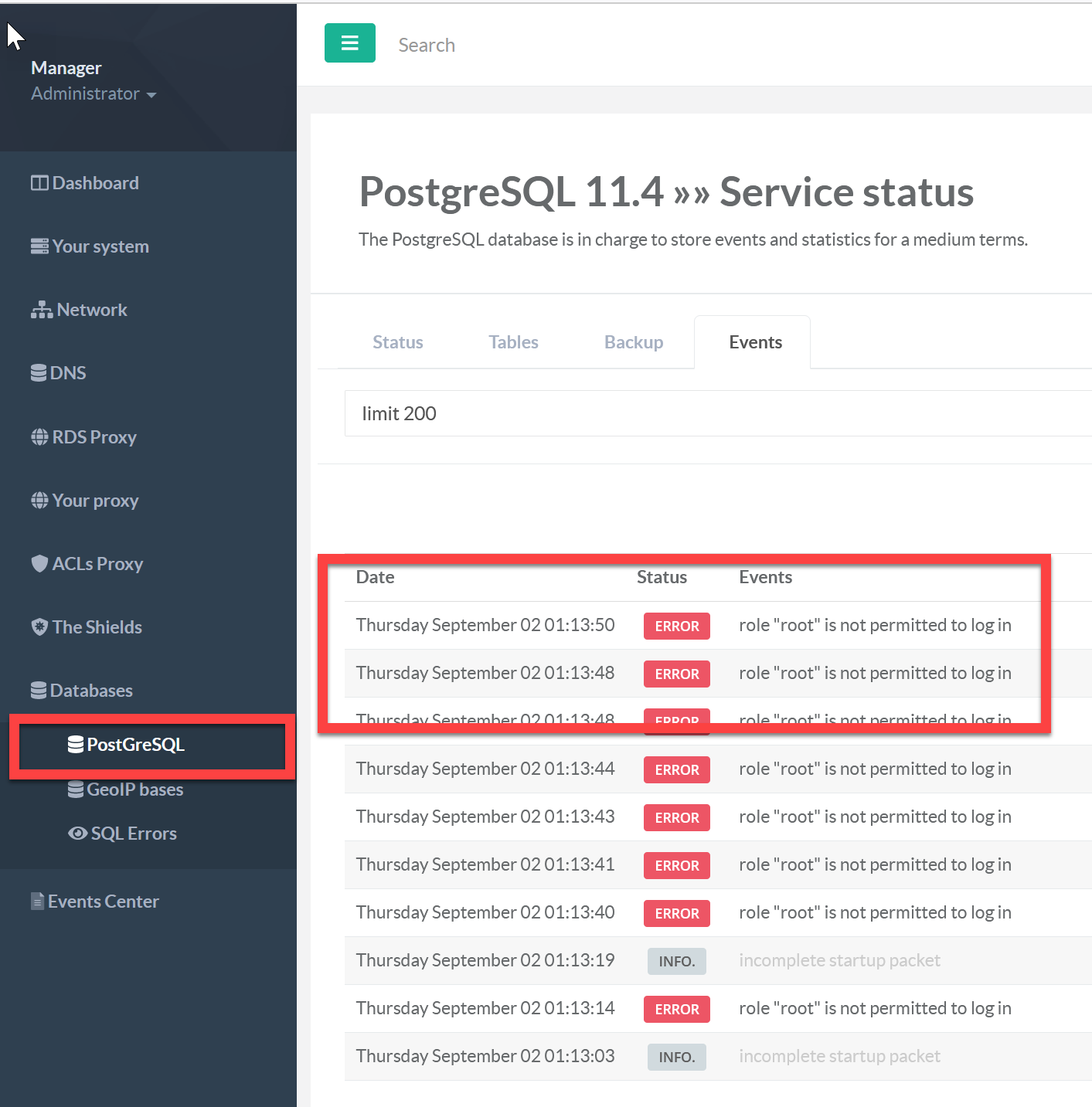 "PostGreSQL" events are showing "role "root" is not permitted to log in".