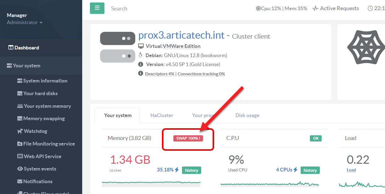 On Artica v4.50 SP1 or Artica v4.50 Hotfix 20250308-22 or Artica v4.50 SP2 a new alert on memory SWAP usage is added on Dashboard.