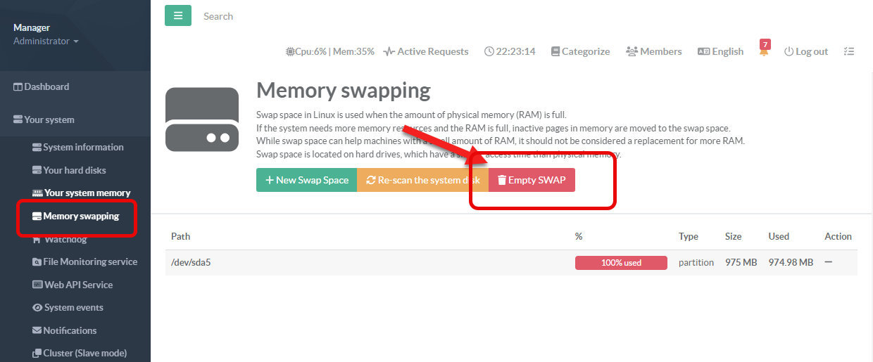 Your System > Memory swappingEmpty SWAP buttonTo avoid destabilizing the server, this operation moves data from paged memory to physical memory.