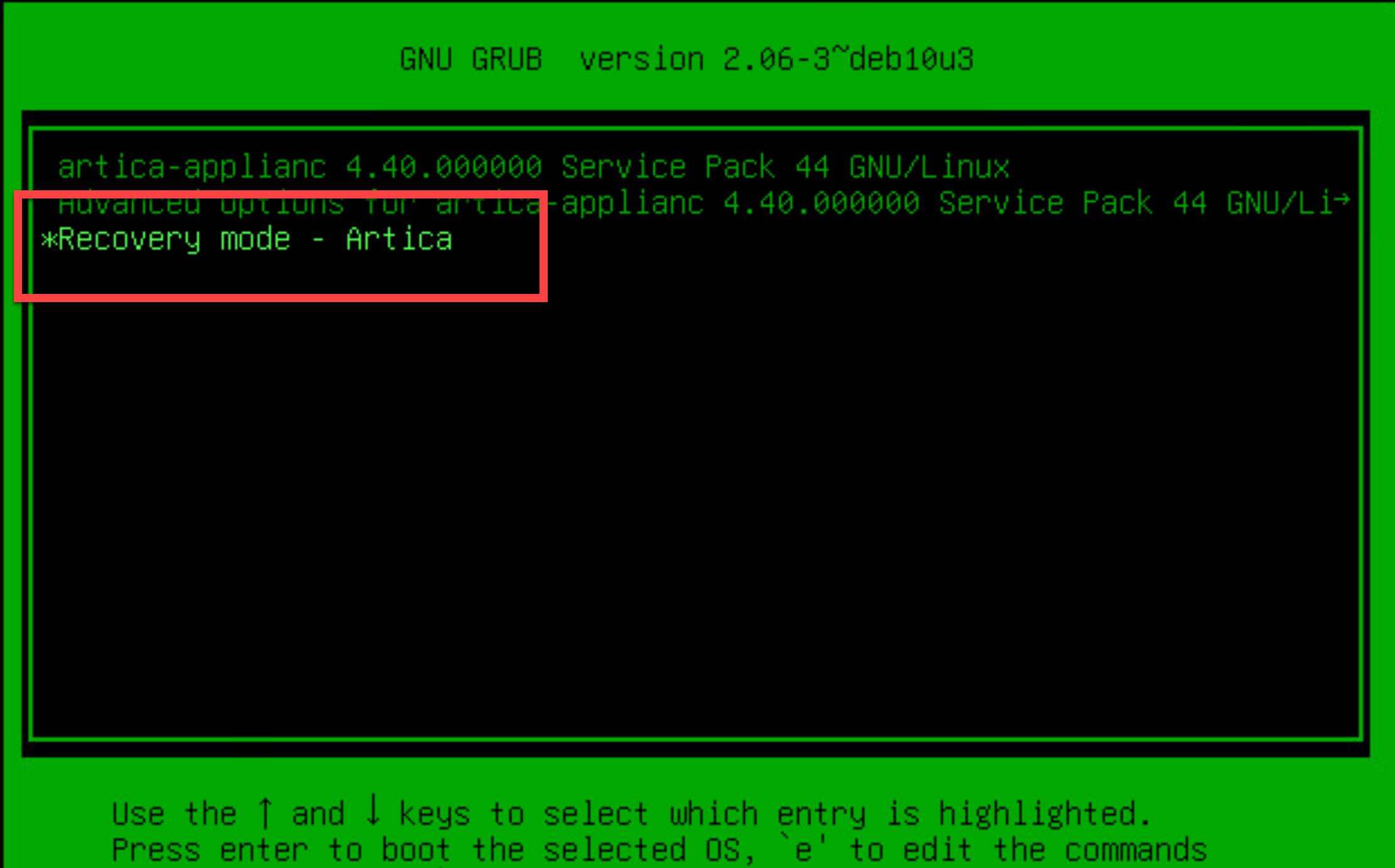 when the system startup, you have an option in the boot “Recovery mode - Artica”