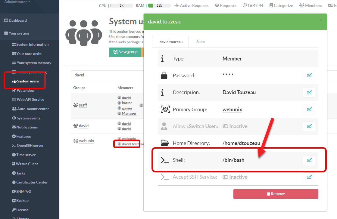 The user shell is the program that runs when a user logs into a Unix/Linux system — it acts as the user's command-line interface. This feature is available on Artica v4.50 Service Pack 3 or Artica v4.50 Service Pack 2 HotFix 20250514-16