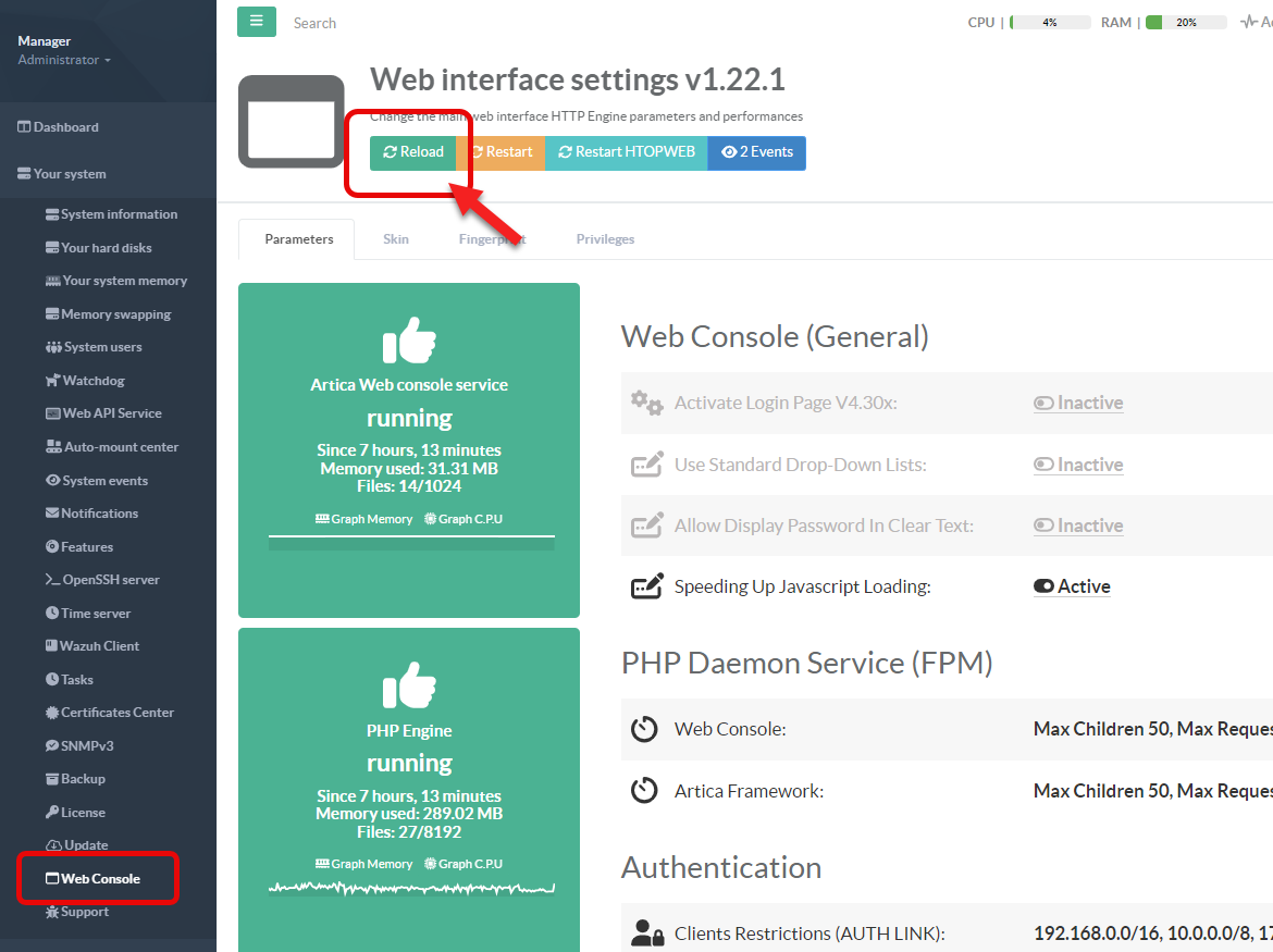 To apply any changes, you must reload the Console service.